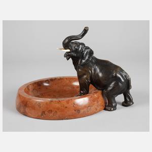 Anfang 20. Jh., unsigniert, Bronze, Marmor, Bein, vollplastischer afrikanischer Elefant aus Bronze mit Stoßzähnen aus Bein, mit erhobenem Rüssel an einer Schale aus Marmor stehend, altersgemäß gut erhalten, H Elefant ca. 17,5 cm, D Schale ca. 21 cm.