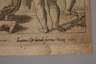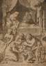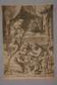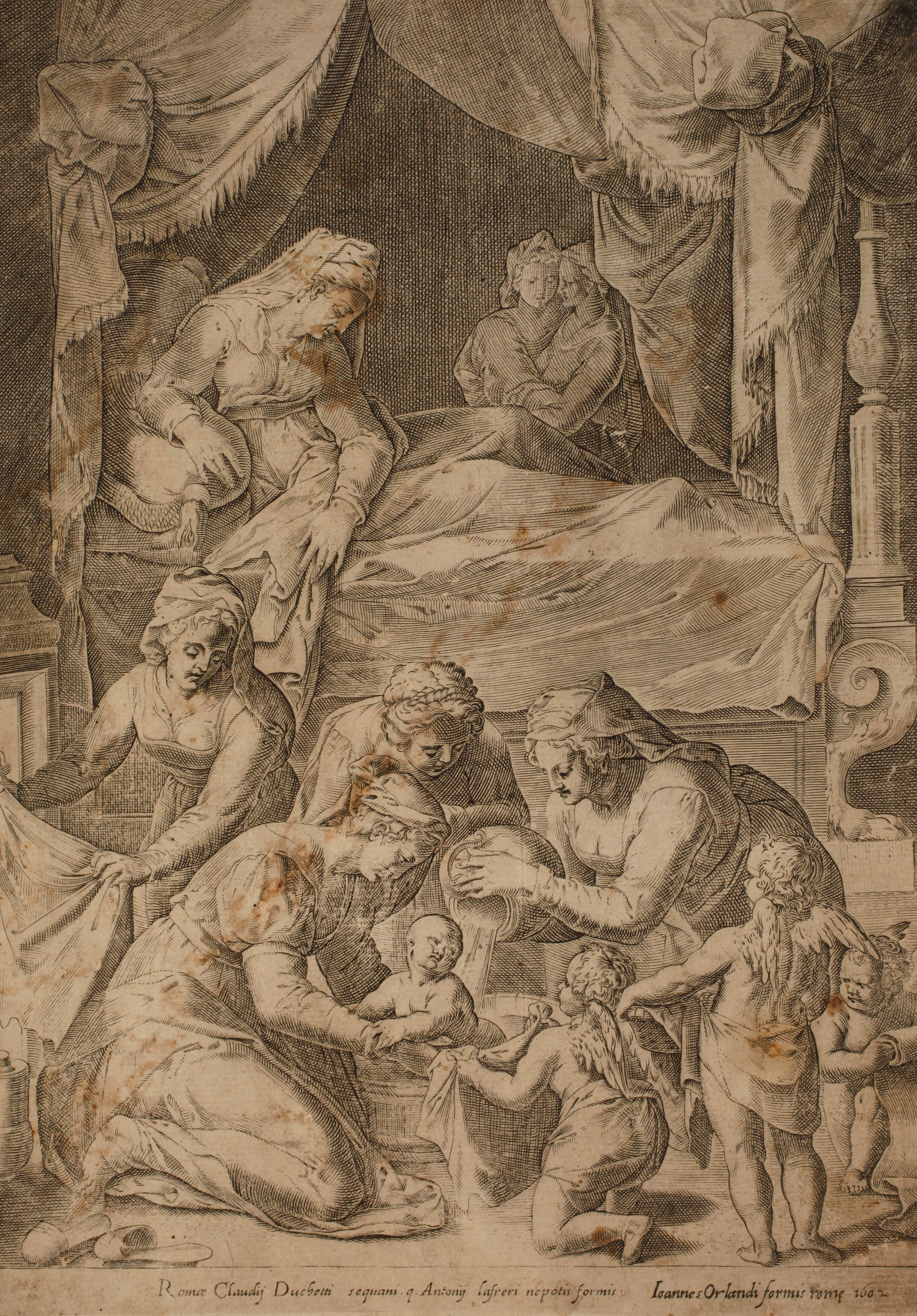 die vom Entbinden geschwächte Mutter in einem Bett mit Baldachin und im Vordergrund vier Frauen und ein paar Putten, das Neugeborene badend, Kupferstich, Entstehung der Druckplatte um 1580, unter der Darstellung bezeichnet "Romae Claudis Duchetti...." (Duchetti war Verleger in Venedig und Rom) und weiterhin "Ioannes Orlandi formis rome 1642" (Johannes Orlandus Besitzer der Druckplatten 1642), Papier gebräunt und teilweise fleckig, rückseitig Klebespuren, teils hinterlegte Einrisse, Darstellungsmaße ohne Schrift ca. 26,8 x 19,4 cm, Blattmaße ca. 29 x 19,6 cm.