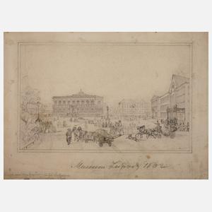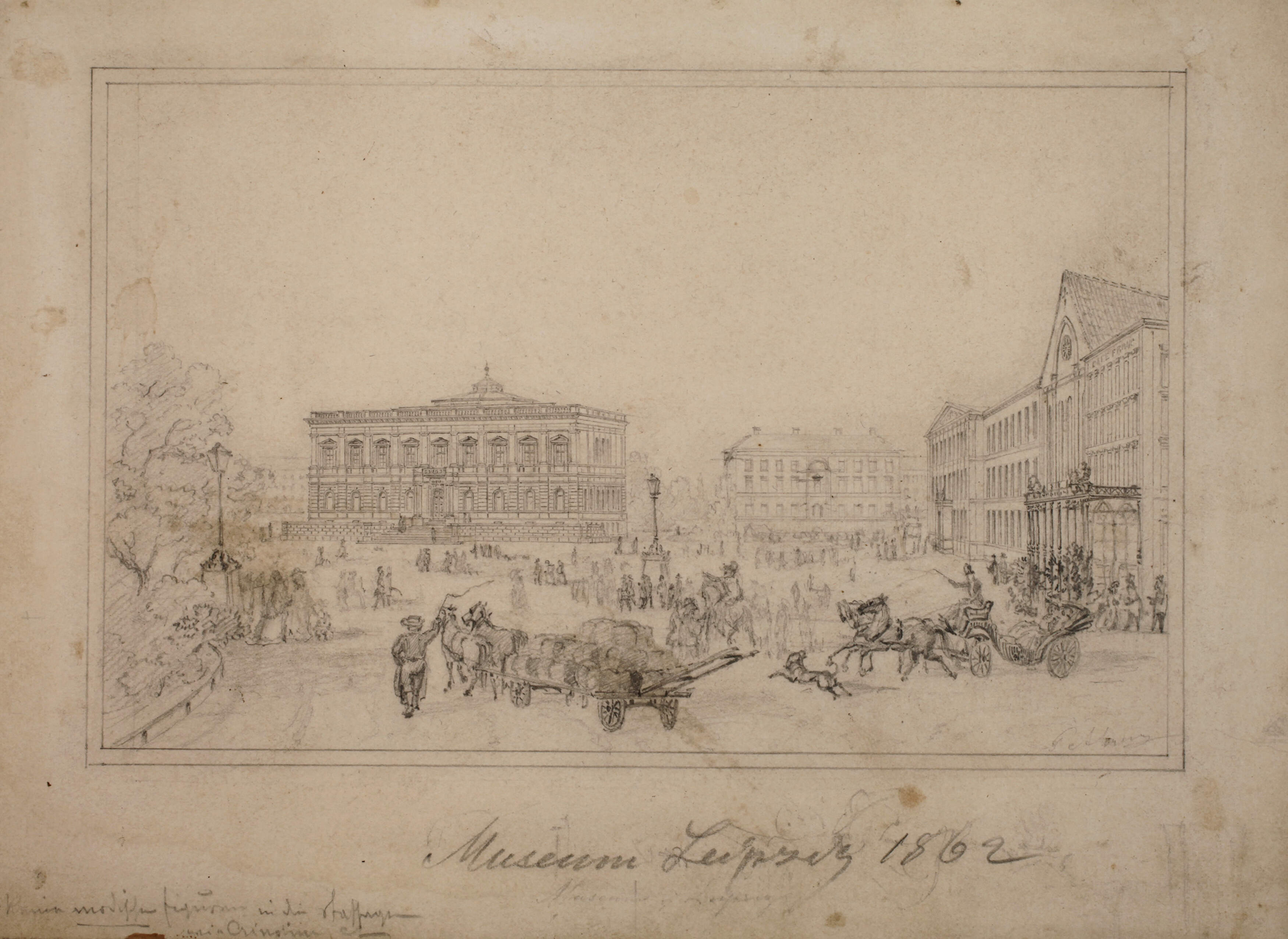 Blick über den Augustusplatz auf das Museum in Leipzig, im rechten Bereich ist Paulinerkirche zu erkennen, wohl Vorlagezeichnung für den von Pl. Ahrens gefertigten Stahlstich, Bleistiftzeichnung auf Karton, unter der Darstellung bezeichnet "Museum Leipzig 1862", in der Darstellung unten rechts schwer lesbar signiert "P. Ahrens", auf Unterlagekarton montiert und hier rückseitig biographische Angaben zum Künstler, leicht fleckig und schmutzspurig, Darstellungsmaße ohne Schrift ca. 10,8 x 16,9 cm, Kartonmaße ca. 15 x 20,5 cm. Künstlerinfo: dt. Stahlstecher des 19. Jh., Quelle: Thieme-Becker.