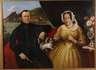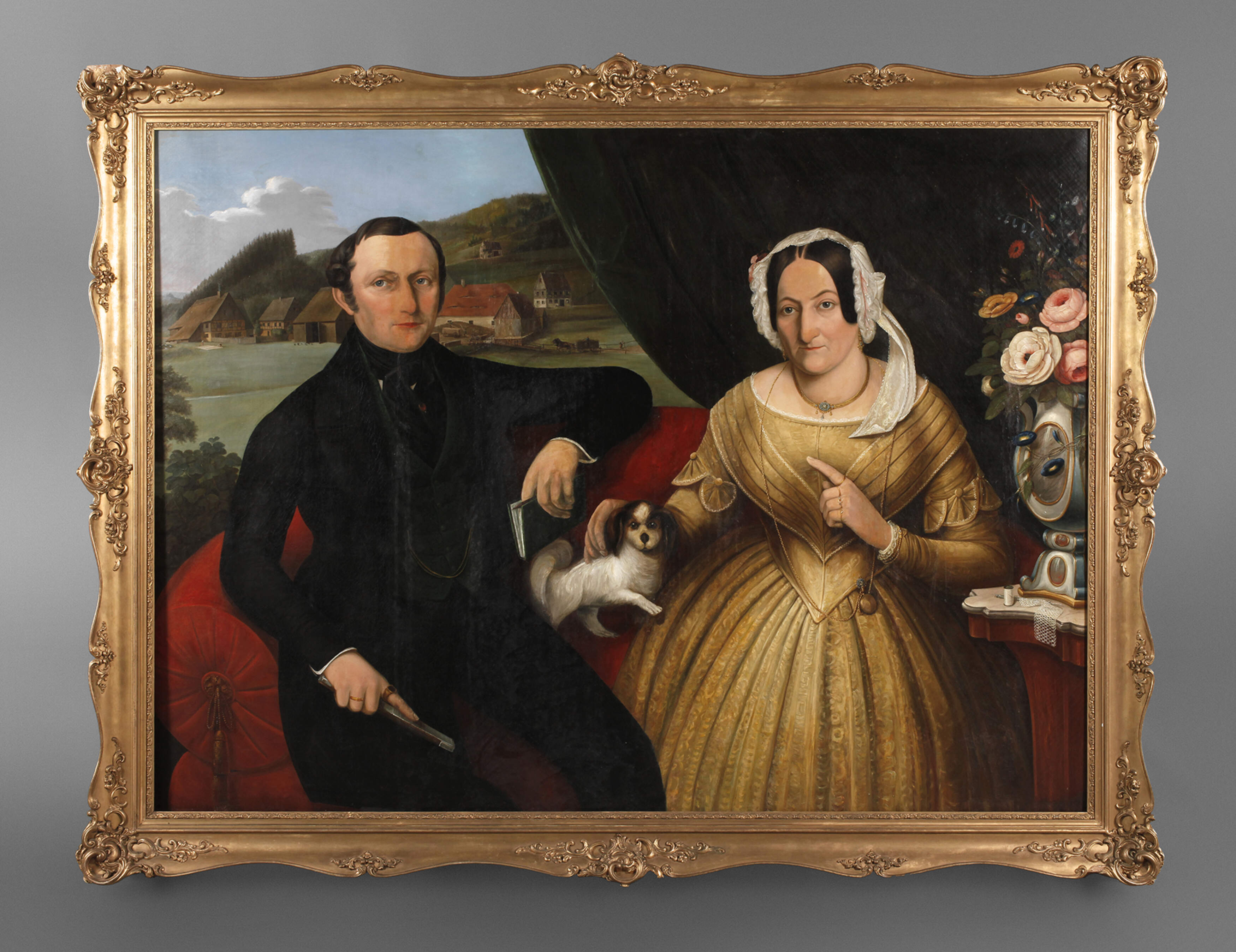 Darstellung eines auf einem roten Biedermeiersofa sitzenden wohlhabenden Ehepaars mit Schoßhund, links der Ehemann im schwarzen Gehrock, mit Zollstock und Schreibkalender in den Händen, rechts seine Ehefrau mit weißer Haube und im gelben Seidenkleid, neben einem Nähtisch mit Blumen und Handarbeitsutensilien, der Hintergrund gibt den Blick frei auf eine Landschaft mit Sägemühle sowie Bauernhof, vor dem Stoffe zur Bleiche ausgelegt sind, laut Vorbesitzerangabe handelt es sich wohl um die Besitzer der Mühlen in Cämmerswalde, OT Rauschenbach bei Neuhausen im Erzgebirge, in der Nähe des Schlosses Purschenstein, fein lasierende Malerei, Öl auf Leinwand, rechts auf dem Nähtisch signiert und undeutlich datiert "Johannes G. M. Stolle XI 1851 [?]", Craquelure, alte Retuschen, etwas restaurierungsbedürftig, im prächtigen Spätbiedermeier-Goldstuckrahmen (rest.bed.), Falzmaße ca. 120 x 164 cm. Künstlerinfo: auch Johann G. M. Stolle, dt. Maler (erwähnt um 1851), wohl identisch mit dem ab 1828 an der Dresdner Akademie studierenden "Johann Anton [?] Stolle", wohl tätig im Erzgebirge, Quelle: Schülerlisten der Dresdner Akademie, Deutsches Jahrbuch für Volkskunde der Akademie der Wissenschaften Berlin 1958 und Info auf Gemälde.