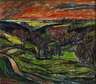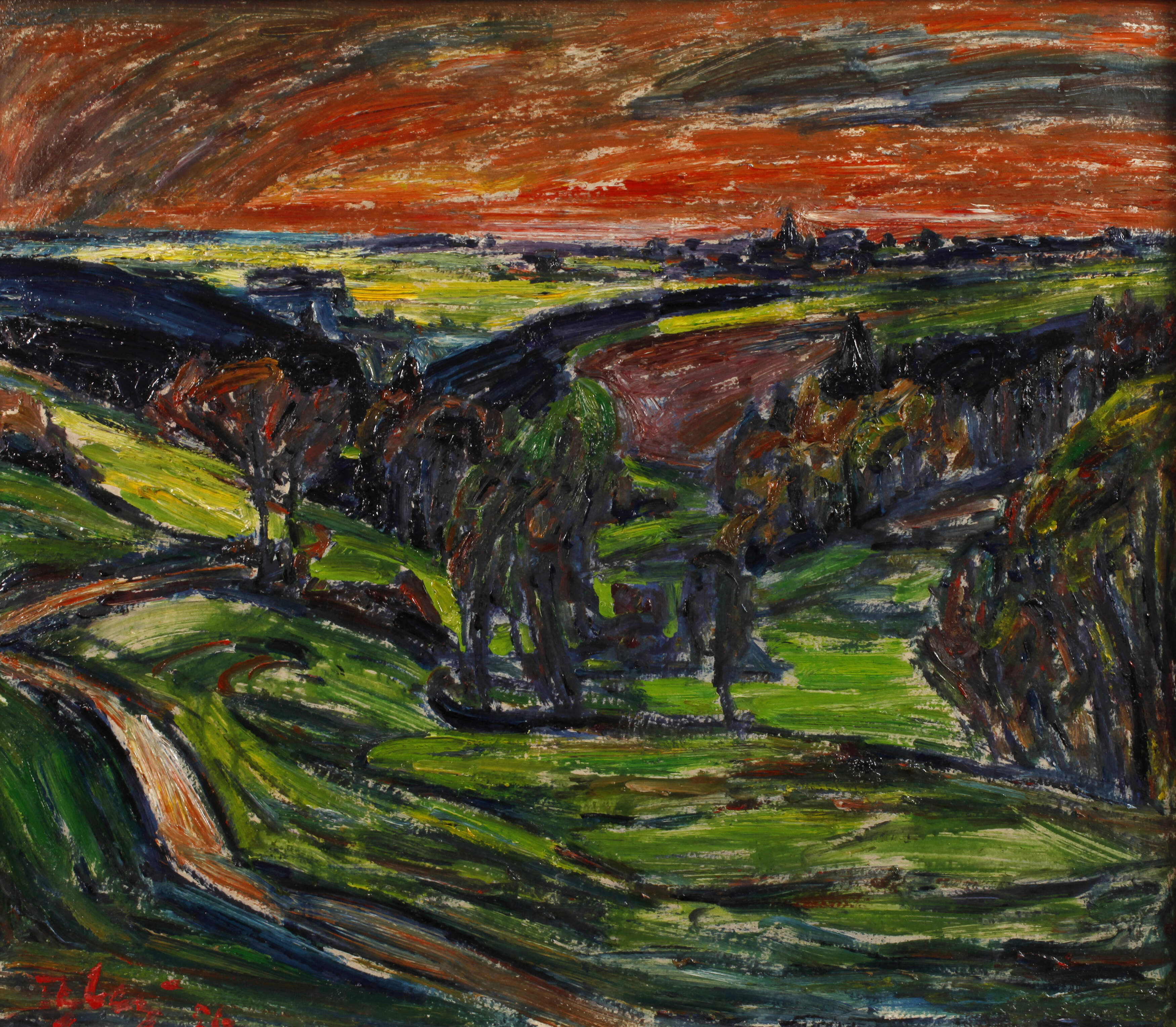 sommerlicher Blick über sich zu Tal schlängelndem Weg, grüne Wiesen, Felder und Bäume im idyllischen Wudelgrund bei Reinsdorf im Vogtland, während im Vordergrund die Landschaft im schwindenden Licht des Tages der Dämmerung anheimfällt, lassen letzte Sonnenstrahlen saftig grüne Felder vorm Dorf am Horizont effektvoll leuchten, während ein rot glühender Abendhimmel die Szene überspannt, der naturverbundene Künstler schilderte in seinen Erinnerungen den nahe seiner Vaterstadt Mylau gelegenen Wudelgrund als das "Paradies" seiner Kindertage, so hat Fredo Bley diesem schönen Fleckchen Erde Zeit seines Lebens in Bildern ein bleibendes Denkmal gesetzt, hier vorliegend eine frühe – nahezu impressionistische wie kraftvoll expressive – Arbeit des Künstlers, in welcher noch der Einfluss seines Lehrers Walter Löhner (1899–1968) zum Tragen kommt, hierzu bemerkt Frank Weiß in "Malerei im Vogtland" (2002): "... Im Werk des 1929 in Mylau geborenen Fredo Bley dominiert die in weitem Sinn verstandene Landschaftsmalerei. Mit ihr ist er zu einem der bekanntesten vogtländischen Gegenwartskünstler geworden. ... In den 1950er Jahren fand er Anschluss an und Anleitung durch den Maler Walter Löhner. Die gemeinsamen Naturstudien bestärkten ihn in der Haltung, dass eine verordnete Motivhierarchie [im Sinne des Bitterfelder Weges] mit Kunst nicht vereinbar sei und dass ein Künstler seinen ihm gemäßen Weg ungeachtet äußerer Forderungen und Bedingungen gehen müsse. ... In der Zeit des gemeinsamen Malens mit Löhner vorübergehend von dessen impressionistischen Stil beeinflusst, hat er bald seine eigene, charakteristische Handschrift entwickelt, ... Er bewegt sich zwischen Impression und Abstraktion, ohne je völlig abstrakt oder gar gegenstandslos zu werden, steigert auf Basis sensibler Erfassung Form und Farbe in expressiver Weise. Sein Streben zielt auf eine Synthese von Impressionismus und Expressionismus. Er suchte und fand direkten und indirekten Rat bei bekannten Malern wie Karl Schmidt-Rottluff, Karl Hofer, Rudolf Bergander oder Hans Grundig. ... Und stets bewunderte er voller Hochachtung die Werke der älteren vogtländischen Meister – von Albin Schlehahn etwa oder Albin Enders, Paul Söllner, Richard Sachs, Rudolf Poeschmann und Kurt Geipel. ... Motivisch sind die Bilder Fredo Bleys, der sich ausdrücklich als vogtländischer Maler versteht und bezeichnet, in der Regel im näheren und weiteren Umkreis seines Wohnortes angesiedelt. Seine ernsthafte Auseinandersetzung mit der vogtländischen Landschaft findet hier einen unerschöpflichen Reichtum und bedarf nicht des aufgesetzten Reizes des Exotischen. ...", stimmungsvolle, pastose Landschaftsmalerei mit charaktervollem, dynamischem Pinselduktus in kraftvoller Farbigkeit, partiell unter Einbeziehung der Farbigkeit des Malgrunds, Öl auf Platte, links unten signiert und datiert "F. Bley [19]56", rückseitig vom Künstler betitelt "Im Wudel", gereinigt, original gerahmt, Falzmaße ca. 58,5 x 67,5 cm. Künstlerinfo: eigentlich Fredo Robert Bley, dt. Maler und Graphiker (1929 Mylau im Vogtland bis 2010 Reichenbach), 1943–46 zusammen mit Wolfgang Mattheuer Lithographenausbildung bei Carl Werner in Reichenbach, um der Dienstverpflichtung zum Uranbergbau der Wismut zu entgehen 1946–48 als Land- und Forstarbeiter in Thüringen tätig, 1948–56 Lehre und Tätigkeit als Dekorations- und Schriftenmaler, Anregung durch den Maler Walter Löhner, weitestgehend Autodidakt, seit 1952 Mitglied des Verbandes Bildender Künstler (VBK) der DDR, aus materiellen Zwängen 1957–64 parallel als Ziegelei- und Baufacharbeiter tätig, ab 1966 freischaffend, parallel zeitweise Werksvertrag mit dem VEB Baumechanik Lengenfeld und bis 1990 Zirkelleiter für Malerei in der "NEMA" Netzschkau, beschickte zahlreiche Ausstellungen, unter anderem 2002 im neuen Bundeskanzleramt Berlin, tätig in Mylau, ab 1960 im selbst errichteten Eigenheim in Buchwald, Quelle: AKL, Eisold “Künstler in der DDR”, Frank Weiß "Malerei im Vogtland" und Wikipedia.