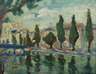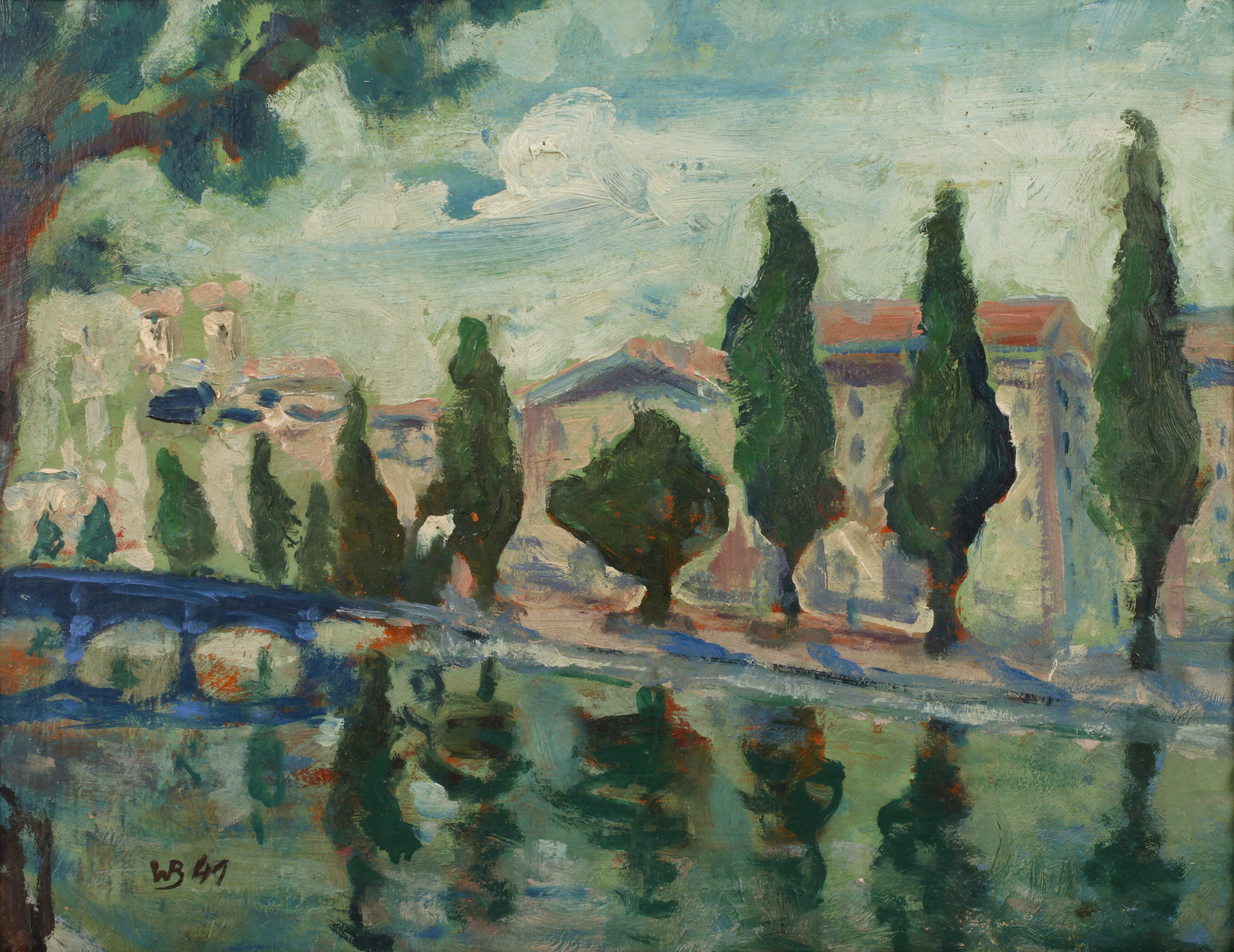 Blick über einen Fluss auf eine Stadt, pastose Landschaftsmalerei, Öl auf Pappe, links unten ligiertes Monogramm und datiert "WB (19)41", Malträger wellig, gerahmt, Falzmaße ca. 41 x 53 cm. Künstlerinfo: dt. Maler und Graphiker (1892 Klitten bis 1988 Leipzig), 1906–10 Lehre als Dekorationsmaler in Falkenberg/Elster, 1910 Umzug nach Leipzig, 1914–18 Kriegsdienst, bis 1944 Tätigkeit als Malergeselle, in der Freizeit autodidaktische Beschäftigung mit der Malerei, 1944–45 durch Denunzierung im KZ Osterode-Petershütte inhaftiert, ab 1952 als freischaffender Maler in Leipzig tätig, Mitglied im VBK der DDR, Quelle: Eisold „Künstler in der DDR“ und Wikipedia.