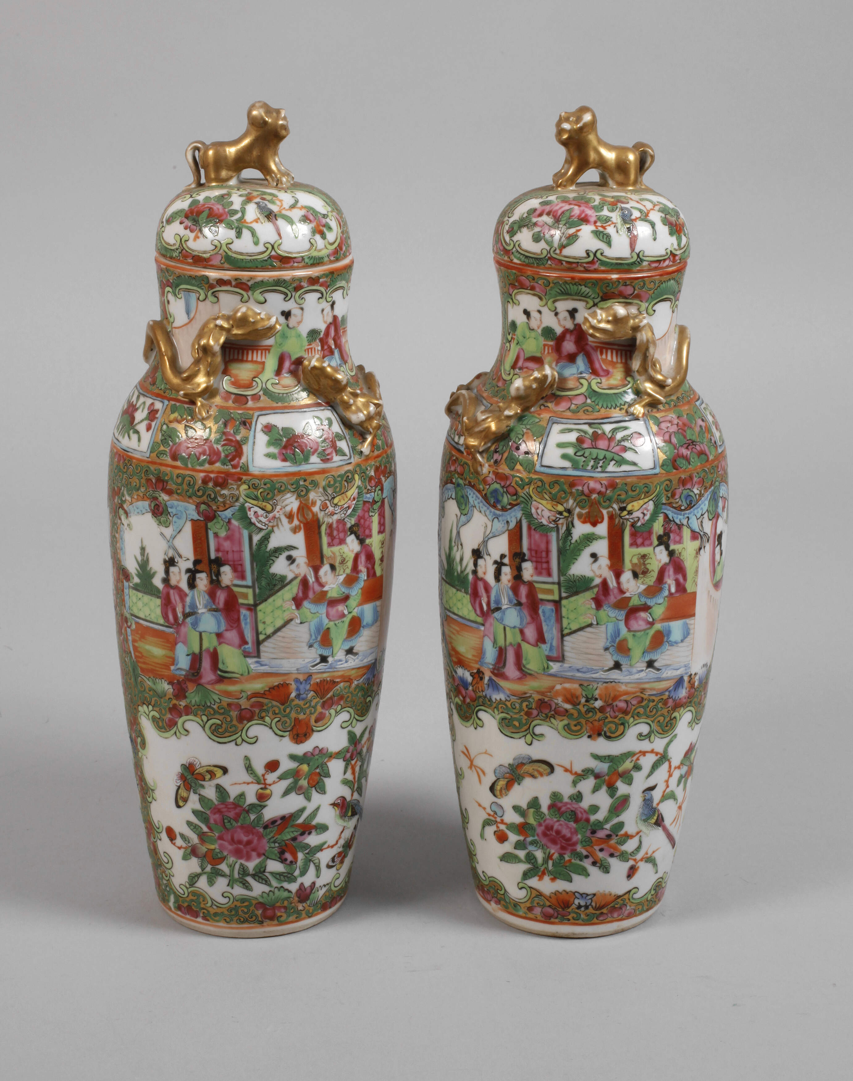 Ende 19. Jh., ungemarkt, Porzellan in polychromer Emaillebemalung und Goldstaffage, hoher schlanker Korpus mit zylindrischem Hals, aufgelegten Drachenmotiven, floral durchmustertem Fond, Front und Rückseite zusätzlich mit figürlichen Bildkartuschen sowie Vogel- und Insektenmotiven, aufgesetzte Kuppeldeckel mit Knauf in Form eines Fo-Hundes, etwas berieben, Glasur rissig, H je 33 cm.