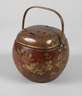 Anfang 20. Jh., Kupferblech getrieben, graviert und goldbronziert sowie mehrfarbig patiniert, leicht abgekanteter Korpus mit durchbrochen gearbeitetem aufgelegten Deckel, zarter klappbarer Handhabe, deren Montierung fehlt einseitig, teils stärkere Alters- und Korrosionsspuren, gedellt, H 15 cm.