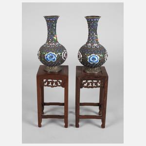 20. Jh., keulenförmige Korpora aus Silber, ungemarkt, geprüft, Verzierungen aus Silbergeflecht mit eingeschmolzenen Partien aus transluzidem und opakem Emaille, umlaufendem Floraldekor und Vogeldarstellung, mit zwei geschnitzten Piedestalen aus dunklem Tropenholz, Altersspuren, H Vase je 15,5 cm, H ges. je 32 cm.