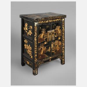 um 1920, zweitüriges Kleinmöbel in schwarzer Lackarbeit, überaus reich bemalt mit Landschaftsdarstellungen, Blüten- und Blattranken, sowie allerlei ornamentalem Dekor, innen mit einem Zwischenboden, die Front mit Montierungen aus Messing, Substanzverluste, Altersspuren, Maße 77 x 61 x 35 cm.
