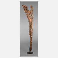 Madagaskar, Gruppe der Mahafaly, 1. Hälfte 20. Jh., weibliche Standfigur in stilisierter Formensprache, einen Wassertrog auf dem Kopf tragend, auf späterem geschwärzten Eisensockel montiert, wurmstichig, kleine Substanzverluste, Altersspuren, H 43,5 cm. Provenienz: 1977 in Ambositra auf Madagaskar erworben, seitdem in zwei deutschen Privatsammlungen.