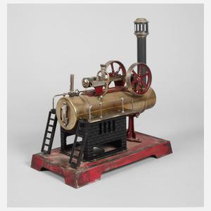 um 1930, gemarkt, Guss und Blech farbig gefasst bzw. blanke Teile vernickelt, Rechaud in Backsteinprägung mit zwei Galerietreppen, liegender Messingkessel mit Sicherheitsventil, Dampfpfeife, Wasserstandsglas, feststehendem Zylinder, zwei Schwungrädern und Schlot, auf Sockel montiert, Funktion nicht geprüft, bespielter und altersgemäßer Zustand mit einer Lötstelle, partiell Farbabplatzer und ohne Brenner, D Kessel 5,5 cm, H gesamt 25,5 cm, Maße Fundament 25 x 12,5 cm.