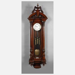 um 1880, mit Wiener 4/4-Schlag, dreiseitig verglastes Nussbaumgehäuse mit Vollsäulen, geschnitzte Bekrönung mit Amphore, drei Gewichte, Ziffernblatt haarrissig, der untere Abschluss lose, zwei kleine Zierleisten fehlen, H 165 cm.