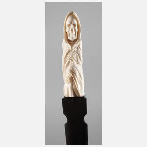 20. Jh., unsigniert, Griffstück aus geschnitztem Horn, in Form eines in Umhang gehüllten Sensenmanns, Papiermesser aus ebonisiertem Holz, L 25 cm.