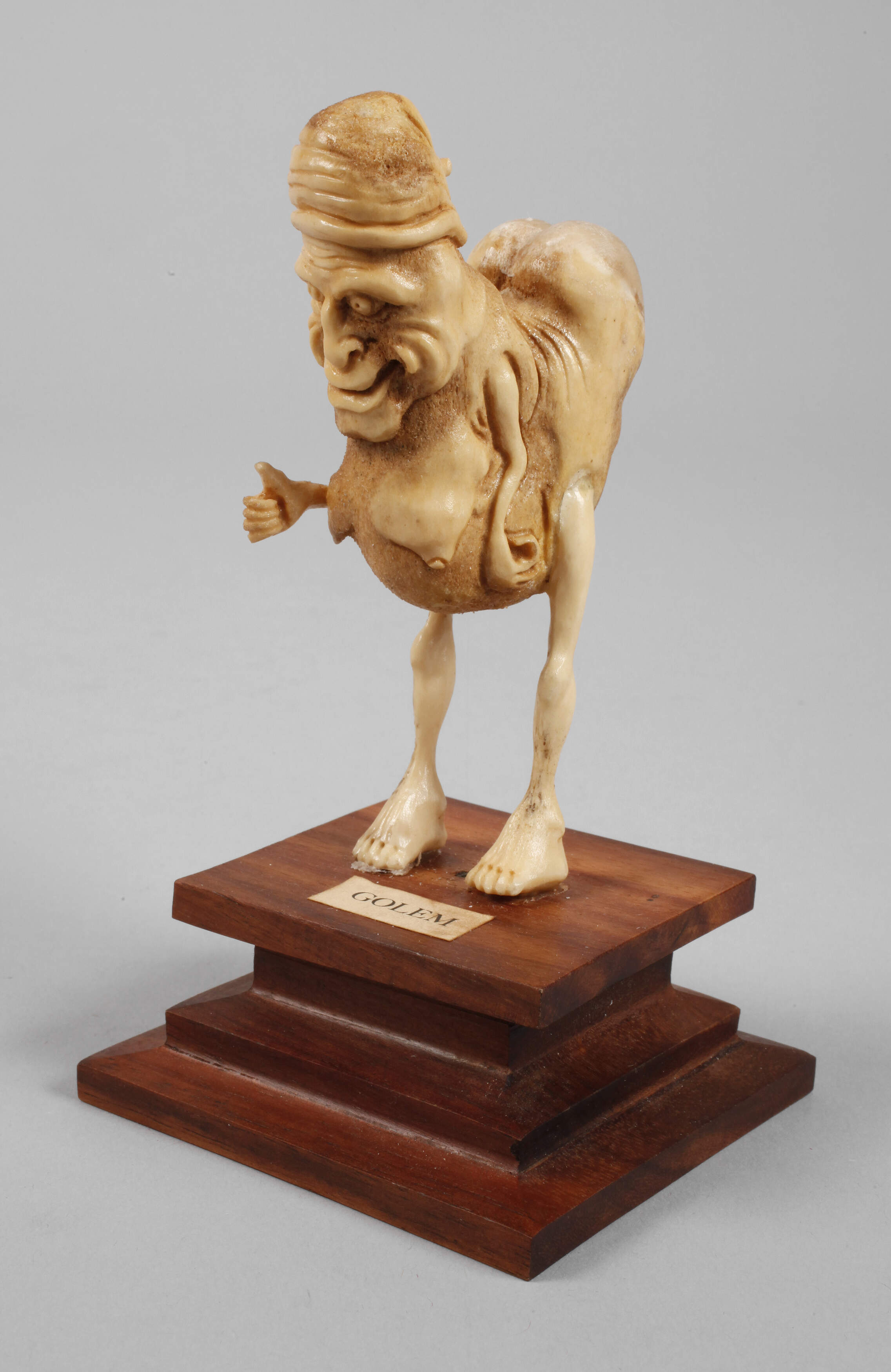 Anfang 20. Jh., unsigniert, betitelt "Golem", aus Horn geschnitztes makabres Wesen mit karikativen Zügen, auf getrepptem Mahagonisockel, winzigst bestoßen, H 15 cm.
