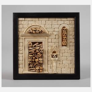20. Jh., monogrammiert MI, Kunstguss, als Wandaufriss einer Kapelle gestaltetes Relief mit Schädeln und Gebein, in schlichter schwarzer Leiste gefasst, Maße 18,5 x 18,5 cm.