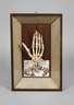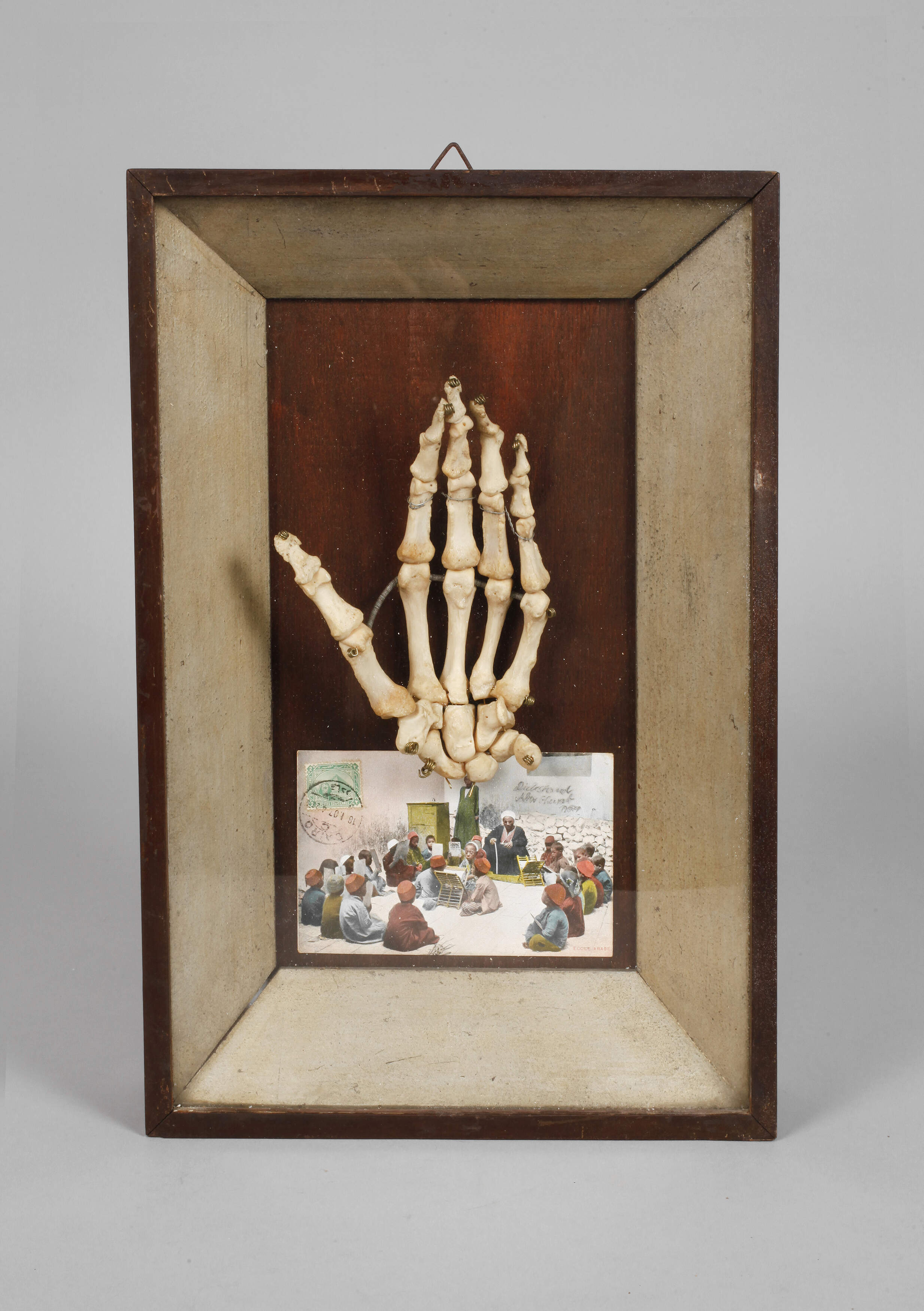 unbestimmten Alters/20. Jh., Replik einer menschliche Hand aus Kunststoff, als Diorama hinter Glas gefasst, als Talisman gelten Hände und Finger von Hingerichteten als heidnisches Symbol einer „Teilhabe an diesem Sühnopfer durch Aneignung irgend eines leiblichen Theils“ und sollen so über glücksbringende und schützende Eigenschaften verfügen, Maße 39 x 26 cm.