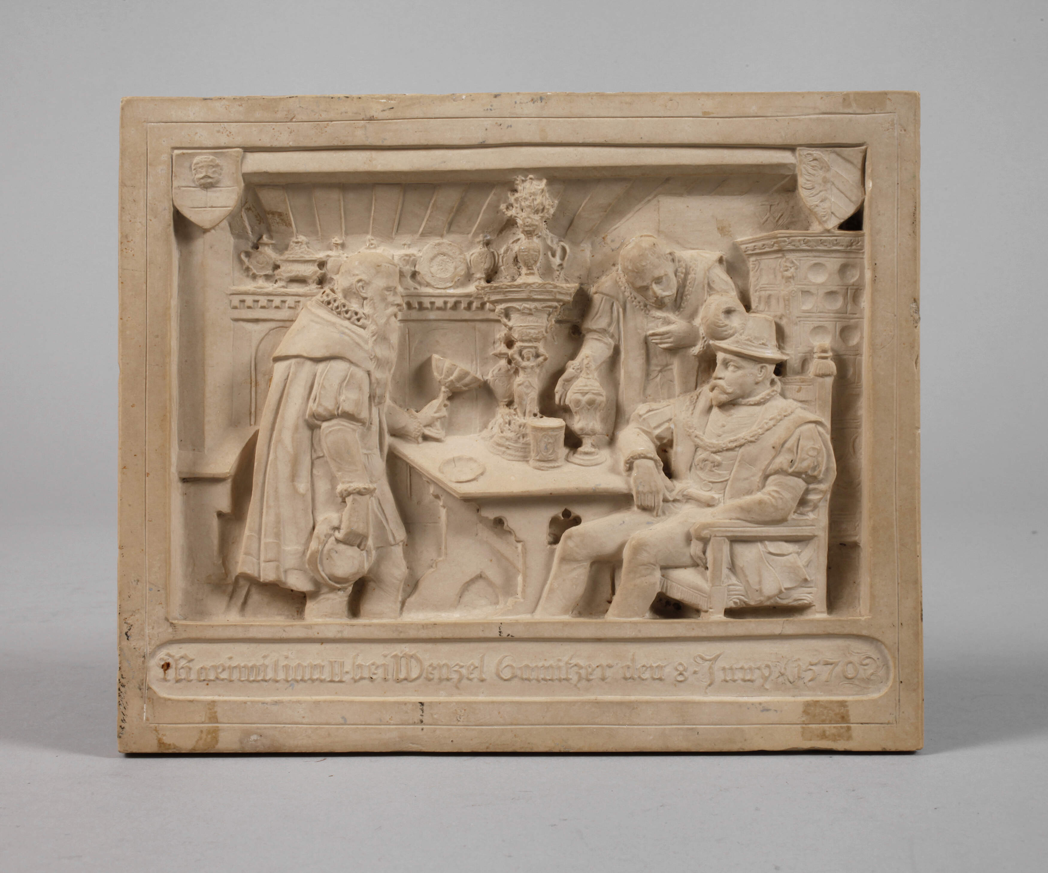 wohl 19. Jh., monogrammiert TW, betitelt Maximilian II. bei Wenzel Gamitzer den 8. ... 1570, Solnhofer Kalkstein aufwendig beschnitzt, detailreich gestaltete Interieurszene mit Darstellung des Nürnberger Goldschmieds Wenzel Jamnitzer, in dessen Werkstatt sich Kaiser Maximilian II. eingefunden hat, auf dem zentral eingefügten Tisch präsentiert der Meister seinen für den Kaiser gefertigten Merkelschen Tafelaufsatz sowie weitere Kleinode, im Hintergrund sieht man weitere Arbeiten des berühmten Nürnberger Künstlers, ein Kopf alt repariert, sonst leichte Altersspuren und im Randbereich kleinste Chips, Maße 15 x 18 cm.
