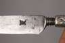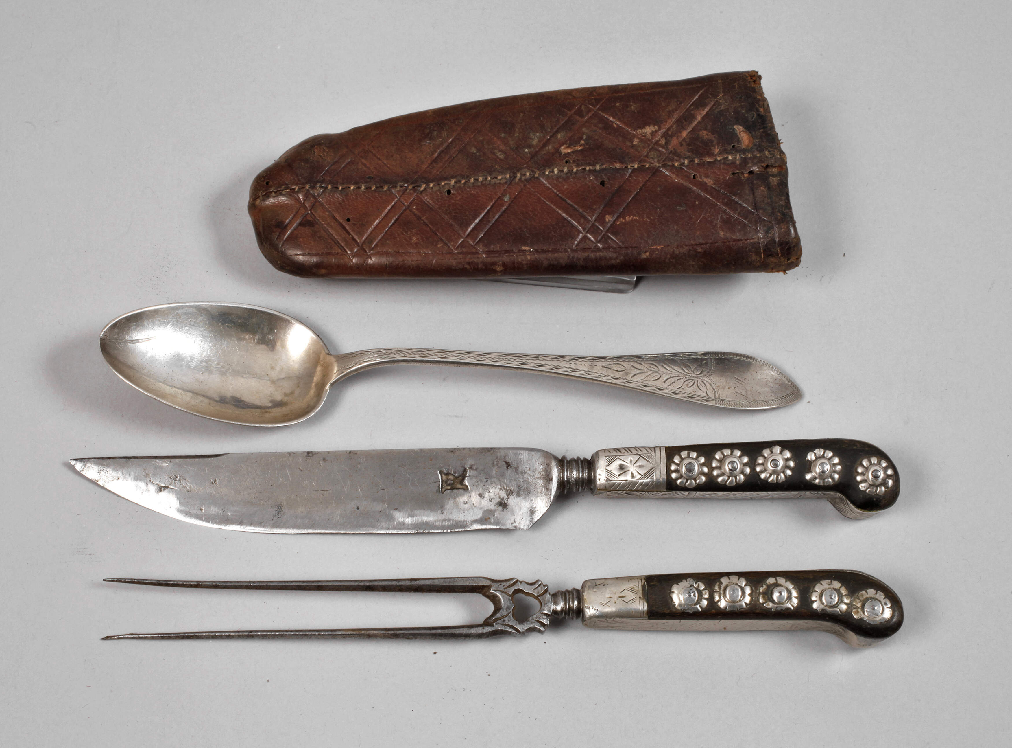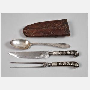 Anfang 19. Jh., Klinge mit undeutlicher Eisenpunze, Holzgriffe mit graviertem floralen Metallbeschlag, Messer, Tranchiergabel und Speiselöffel, dieser Silber gestempelt sowie monogrammiert A.W.N., in gepunztem Lederetui, Alters- und Gebrauchsspuren, L max. ca. 22,5 cm.