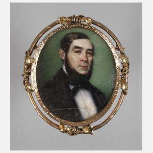 Mitte 19. Jh., unsigniert, Gouache auf Bein, in feinster Lupenmalerei ausgeführtes Bildnis eines Mannes mit Schifferkrause, im dunklen Frack vor monochromem Grund, hinter Glas in vergoldeter Fassung mit rückseitiger Nadel, Platte mit Rissbildung, H 6,5 cm.