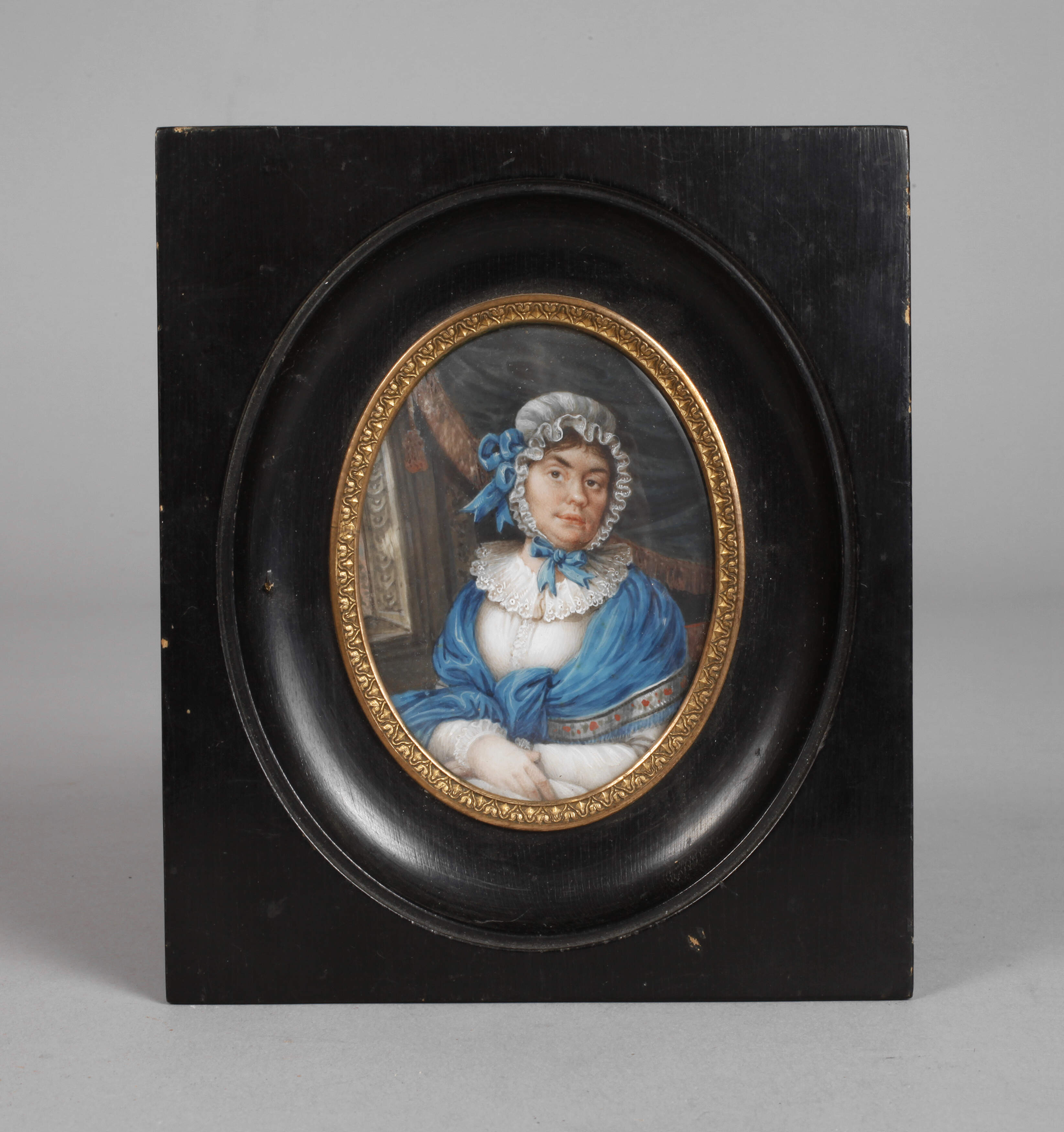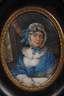 19. Jh., unsigniert, hinten undeutlich annotiert und nummeriert 4183 sowie bezeichnet 1756, Halbfigurenbildnis einer Dame in Haube und Spitzendress, um die Schultern ein besticktes Tuch geschlungen, im Interieur am Fenster, in geschwärzter Leiste hinter Glas im Oval gefasst, leichte Altersspuren, IM 8,5 x 6 cm.