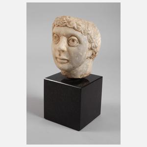 wohl etruskisch, unbestimmten Alters, heller Marmor, behauen, Haupt eines Jünglings mit stilisierten Gesichtszügen und festem Blick, als Lockenfrisur herausgearbeitete Haarpartie, fragmentarische Erhaltung, auf späterem Steinsockel montiert, H 24 cm. Provenienz: laut Einliefererangabe aus der Sammlung Dr. Langendörfer.