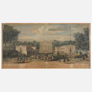 Ansicht des Eingangs und Ehrenhofs des 1679–86 durch Ludwig XIV. bei Marly/Ile-de-France errichteten barocken Jagd- und Sommerschlosses mit Höflingen und ankommenden Kutschen der königlichen Entourage, hierzu schreibt Nagler (1843): "... J. Rigaud widmete sich ausschliesslich der Radirkunst, und lieferte zahlreiche Blätter, die größere Beachtung verdienen, ... Viele bieten Ansichten von Paris, der königlichen Schlösser und anderer Staatsgebäude. Als completes Werk haben sie den Haupttitel: »Maisons royales et autres palais remarquables en Francais [dt.: Königshäuser und andere bemerkenswerte Paläste in Frankreich]«. ...", vorliegendes Blatt zählt zur bei Nagler aufgeführten Folge "... 27) Sechs verschiedene Ansichten des Schlosses von Marly qu. fol. ...", kolorierter Kupferstich auf Bütten, 1. Hälfte 18. Jh., unten mittig in der Platte frz. bezeichnet "Diverces Vuës du Chateau Royal de Marli – Cette premiere vuë est prise à la principale Entrée proche la grille en arivant de Paris (dt.: Verschiedene Ansichten des Chateau Royal de Marli – Diese erste Ansicht wurde am Haupteingang in der Nähe des Tors aufgenommen, wenn Sie aus Paris anreisen]" darunter Angabe der Bezugsadresse "à Paris chez l´Auteur ruë St. Jacques vis a vis le College du Plessis [dt.: in Paris im Hause des Autors in der Rue St. Jacques gegenüber dem College du Plessis]", links unter der Darstellung signiert "J. Rigaud In. sculp. [J. Rigaud, erdacht, gestuchen]" und rechts Privileg "avec Privilege du Roy [dt.: mit königlicher Erlaubnis]", Falt- und Altersspuren, hinter Glas und Passepartout im klassizistischen Leistenrahmen mit quadrierten Ecken in Zweitverwendung gerahmt, Plattenmaße ca. 26 x 48,5 cm. Künstlerinfo: frz. Maler, Zeichner und Graphiker (1680 Puyloubier/Bouches-du-Rhône bis 1754 Paris), um 1707 Eintritt ins Büro des Generaldirektors der französischen Befestigungsanlagen Le Pelletier, lebte in der Provence, schließlich bis 1720 in Marseille, ab 1720 als Radierer und Verleger in der Rue St. Jacques in Paris tätig, ab 1730 Herausgabe der bedeutenden Serie "Les Maisons Royales de France [dt.: Die Königshäuser von Frankreich]", welche von seinem Neffen Jean-Baptiste Rigaud vervollständigt wurde, 1733 und 1736 Reise nach England, Quelle: Thieme-Becker, Vollmer, Saur "Bio-Bibliographisches Künstlerlexikon", Müller-Singer, Nagler und Bénézit.