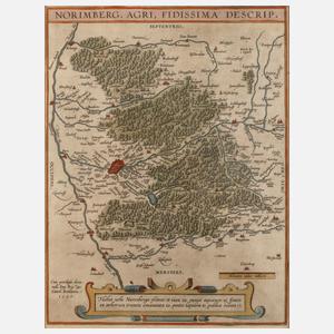 oberhalb der Darstellung bezeichnet "Norimberg, agri, fidissima descrip.", Darstellung des Gebiets um Nürnberg, bis nach Erlangen im Norden, Hersbruck im Osten, Schwabach im Süden und Fürth im Westen reichend, im unteren Bereich Kartusche in der Art der Zeit, links unten in der Platte bezeichnet und datiert "Cum privilegio decennali, Imp. Reg. Cancel. Brabantiae 1590", verlegt bei Abraham Ortelius, teilkolorierter Kupferstich, etwas gegilbt, unter Passepartout (fleckig) und hinter Glas gerahmt, Darstellungsmaße ca. 30,5 x 23,5 cm. Künstlerinfo: flämischer Geograph und Kartograph (1527 Antwerpen bis 1598 Antwerpen), entstammt einer aus Augsburg in die Niederlande eingewanderten Familie Örtel (Oertel), gilt als der Begründer der modernen Kartographie, nach Mathematik-, Griechisch- und Lateinstudium in Antwerpen als Karten- und Buchhändler tätig, bildete sich zum Kartographen weiter, gab 1570 die erste Ausgabe seines später in 42 Ausgaben und 7 Sprachen erschienenen "Theatrum Orbis Terrarum" heraus, die die erste Sammlung von Landkarten in Buchform darstellt, Quelle: Thieme-Becker, Wikipedia und Internet.