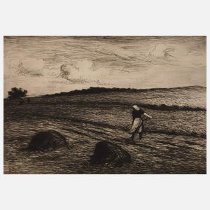 Bäuerin beim Wenden von Heu, Radierung mit schönem Plattenton, unter der Darstellung rechts in Blei signiert "Gleichen-Russwurm", in der Platte links unten monogrammiert und datiert "G-R. (18)96", etwas fleckig und angestaubt, Darstellungsmaße ca. 17 x 24,5 cm, Blattmaße ca. 35 x 51 cm. Künstlerinfo: eigentlich Heinrich Ludwig von Gleichen-Rußwurm, dt. Maler und Grafiker (1836 Schloss Greifenstein in Bonnland/Unterfranken bis 1901 Weimar), 1865 nach dem frühen Tod seiner Frau Hinwendung zur Malerei, 1869 Förderung durch Großherzog Carl Alexander von Sachsen-Weimar-Eisenach und Umzug nach Weimar, Studium an der Großherzoglichen Kunstschule bei Max Schmidt und ab 1871 bei Theodor Hagen, 1876 Frankreichaufenthalt und beeinflusst durch die Schule von Barbizon, durch Anraten von Albert Brendel Beschäftigung mit der Radiertechnik, zahlreiche Studienreisen nach Frankreich, Italien, Helgoland, Quellen: Thieme-Becker, Wikipedia.