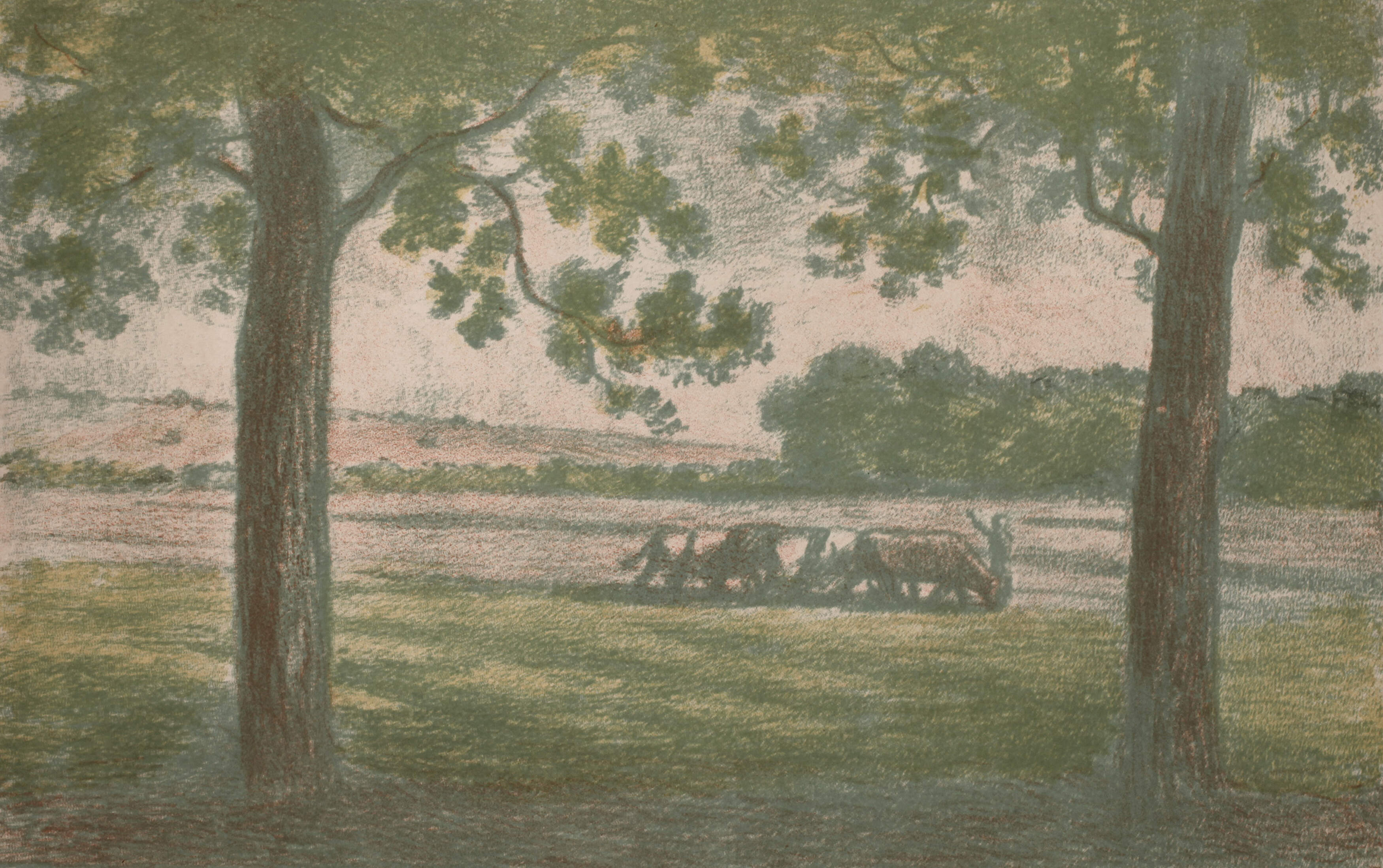 Blick von einer Allee auf ein Feld mit pflügenden Bauern, Farblithographie, um 1900, rechts unter der Darstellung in Blei signiert "Gleichen-Russwurm", fleckig, wenige Einrisse und Knickspuren, Darstellungsmaße ca. 31,5 x 49 cm, Blattmaße ca. 37,5 x 53 cm. Künstlerinfo: eigentlich Heinrich Ludwig von Gleichen-Rußwurm, dt. Maler und Grafiker (1836 Schloss Greifenstein in Bonnland/Unterfranken bis 1901 Weimar), 1865 nach dem frühen Tod seiner Frau Hinwendung zur Malerei, 1869 Förderung durch Großherzog Carl Alexander von Sachsen-Weimar-Eisenach und Umzug nach Weimar, Studium an der Großherzoglichen Kunstschule bei Max Schmidt und ab 1871 bei Theodor Hagen, 1876 Frankreichaufenthalt und beeinflusst durch die Schule von Barbizon, durch Anraten von Albert Brendel Beschäftigung mit der Radiertechnik, zahlreiche Studienreisen nach Frankreich, Italien, Helgoland, Quellen: Thieme-Becker, Wikipedia.