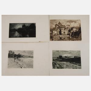 vier Radierungen, Diez an der Lahn, Darstellungsmaße ca. 21 x 29 cm, Blattmaße ca. 35 x 51 cm; Landschaft mit Stadt im Mondschein, Darstellungsmaße ca. 14,5 x 25 cm, Blattmaße ca. 35 x 51 cm; leicht bewegte Landschaft mit Baumgruppen, Darstellungsmaße ca. 16,5 x 25,5 cm, Blattmaße ca. 35 x 50 cm und am Flussufer, Darstellungsmaße ca. 16 x 23 cm, Blattmaße ca. 34,5 x 49,5 cm, um 1900, jeweils in der Platte signiert, etwas fleckig und lichtrandig (an den Blattkanten). Künstlerinfo: eigentlich Theodor Joseph Hagen, dt. Maler und Grafiker (1842 Düsseldorf bis 1919 Weimar), 1863–68 Studium an der Kunstakademie Düsseldorf bei Oswald Achenbach, 1871 Berufung an die Großherzogliche Kunstschule in Weimar, hier unter anderem Lehrer von Christian Rohlfs, 1876–81 Leiter der Kunstschule Weimar, ab 1886 Direktor der Hamburger Kunsthalle, wichtiger Vertreter der Weimarer Malerschule, Ausstellungsbeteiligungen unter anderem an der Berliner Akademie, dem Deutscher Künstlerbund Weimar und im Glaspalast München, Mitgliedschaften: Münchner Sezession, Berliner Sezession und Deutscher Künstlerbund, Quelle: Thieme-Becker, AKL und Wikipedia.