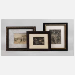 drei Graphiken, Zwerge und Eichhörnchen auf dem Baum, kolorierte Xylographie, Passepartoutausschnitt ca. 23 x 18 cm; der Maler auf dem Land, umgeben von Kindern, kolorierte Strichätzung, Passepartoutausschnitt ca. 17 x 22 cm und Flöte spielende Zwerge und Frösche, Offsetdruck, Passepartoutausschnitt ca. 12 x17,5 cm, zwei Arbeiten im Medium signiert, einmal datiert "(18)85", jeweils unter Passepartout und hinter Glas gerahmt. Künstlerinfo: dt. Fayencemaler, Maler und Illustrator (1849 Biebrich-Mosbach bis 1923 München), zunächst Schüler von Kaspar Kögler in Wiesbaden, Schüler der Münchner Kunstgewerbeschule bei Ferdinand Barth, studierte ab 1875 bzw. 1876 an der Akademie München bei Wilhelm von Lindenschmit, Mitglied der "Luitpoldgruppe", berühmt als "Münchner Gnomenmaler" für seine Gnomen- und Zwergendarstellungen (1878–1921), tätig in München und Wiesbaden, Quelle: Thieme-Becker, Internet, Matrikel der Akademie München und ausführlicher Artikel im "Sammler-Journal 8/2007".