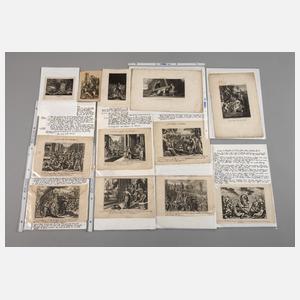 21 Blatt, enthält Kupferstichfolge mit biblischen Szenen (14 Blatt), einen Reichsdruck nach Albrecht Dürer, fünf religiöse Darstellungen und eine Darstellung des Amselfalls in der Sächsischen Schweiz, teils auf Papier montiert, unterschiedliche Erhaltung, Blattmaße max. 18 x 27,5 cm.
