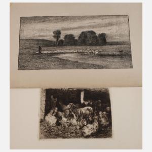 zwei Graphiken, Albert Heinrich Brendel, Im Schafstall, Radierung, um 1890, in der Platte signiert "A. Brendel", etwas braunfleckig, Darstellungsmaße ca. 18 x 23,5 cm, Blattmaße ca. 37 x 50 cm; Heinrich Ludwig von Gleichen-Rußwurm, Schäfer in flacher Landschaft, Lithographie, um 1900, im Stein monogrammiert "G-R", fleckig, Einrisse im Randbereich, leicht angestaubt und kleinere Schadstellen, Darstellungsmaße ca. 22,5 x 40 cm, Blattmaße ca. 36 x 53 cm. Künstlerinfo Albert Heinrich Brendel: eigentlich Albert Heinrich Brendel, dt. Tiermaler und Graphiker (1827 Berlin bis 1895 Weimar), zunächst Schüler des Landschaftsmalers Wilhelm Schirmer, studierte an der Akademie Berlin, weitergebildet bei dem Marinemaler Wilhelm Krause, parallel Studium der Tiermalerei an der Tierarzneischule zu Berlin, 1851 Studienreise über Holland, die Normandie nach Paris, hier Schüler von Thomas Couture und des Landschafts- und Tiermalers Guiseppe Palizzi, 1852 Studienreise durch Italien und Sizilien, 1854–64 tätig in Paris mit Sommeraufenthalten in Barbizon und Anschluss an die Malergruppe von Théodore Rousseau, Jean-François Millet und Constant Troyon im Wald von Fontainebleau, 1869–75 in Berlin ansässig, 1875 Übersiedlung nach Weimar und Berufung zum Professor an die Weimarer Kunstschule, 1882–85 deren Direktor, Ehrenmitglied der Berliner Akademie, tätig in Berlin, Barbizon und Weimar, Quelle: Thieme-Becker, Meyers Konversationslexikon und Internet. Künstlerinfo Heinrich von Gleichen-Rußwurm: eigentlich Heinrich Ludwig von Gleichen-Rußwurm, dt. Maler und Grafiker (1836 Schloss Greifenstein in Bonnland/Unterfranken bis 1901 Weimar), 1865 nach dem frühen Tod seiner Frau Hinwendung zur Malerei, 1869 Förderung durch Großherzog Carl Alexander von Sachsen-Weimar-Eisenach und Umzug nach Weimar, Studium an der Großherzoglichen Kunstschule bei Max Schmidt und ab 1871 bei Theodor Hagen, 1876 Frankreichaufenthalt und beeinflusst durch die Schule von Barbizon, durch Anraten von Albert Brendel Beschäftigung mit der Radiertechnik, zahlreiche Studienreisen nach Frankreich, Italien, Helgoland, Quellen: Thieme-Becker, Wikipedia.