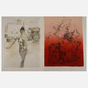 figurative Komposition, Farblithographie auf Japanpapier, Darstellungsgröße ca. 60,5 x 45,5 cm und Zirkusszene, Farblithographie auf Japanpapier, Darstellungsgröße ca. 59 x 42,5 cm, jeweils in Blei unter der Darstellung signiert "Otto Bachmann" und eine Arbeit datiert "(19)64", weiterhin Nummerierung L/XXX" bzw. bezeichnet "e.a.", minimal fleckig und außerhalb der Darstellung knitterspurig. Künstlerinfo: schweizerischer Maler, Graphiker und Illustrator (1915 Luzern bis 1996 Ascona), Lehre als Graphiker an der Kunstgewerbeschule Luzern, anschließend Umzug nach Zürich und hier in einer Werbeagentur tätig, gab seine Anstellung auf, um als freier Künstler tätig zu sein, 1943 erhielt er mit seiner Faustmappe große Anerkennung, Mitglied der „Schlaraffia“, 1944 Übersiedlung nach Ascona, 1995 Verleihung des Premio Cultura der Gemeinde Ascona, Quelle: Wikipedia und sikart.