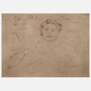 in einem Bett liegende Dame mit zum Betrachter gerichtetem Blick, siehe Werksverzeichnis Schwarz 37, Radierung in Braun mit zartem, gleichmäßigem Plattenton, 1909, unter der Darstellung in Blei rechts signiert "Lovis Corinth", leicht gegilbt, hinter Glas gerahmt, Darstellungsmaße ca. 14,8 x 20 cm, Blattmaße ca. 30 x 40 cm. Künstlerinfo: eigentlich Franz Heinrich Louis Corinth, bedeutender dt. Maler, Lithograph und Radierer (1858 Tapiau/Ostpreußen bis 1925 Zandvoort), Studium an der Akademie Königsberg bei Otto Günther und ab 1880 an der Akademie München bei Franz von Defregger und Ludwig von Loefftz, beeinflusst von Wilhelm Trübner, als Radierer angelernt von Otto Eckmann, später in Paris und Bouguereau, neben Max Liebermann und Max Slevogt wichtigstes Mitglied der Berliner Sezession, 1918 Verleihung des Professorentitels durch die Berliner Akademie der Künste, 1921 Ehrendoktorwürde der Universität Königsberg, tätig in Berlin und Urfeld am Walchensee, Quellen: Thieme-Becker, Vollmer, Matrikel der Akademie München und Internet.