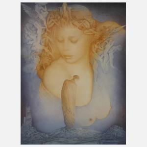 phantasievolle blaue Landschaft mit Frauengestalten, Farboffset auf Velin, im unteren Bereich betitelt, datiert, nummeriert und signiert "Blaues Haus 1984 179/200 Wolfgang Fratscher (19)92", Blattmaße ca. 82 x 60 cm. Künstlerinfo: dt. Graphiker (1944 Rendsburg bis 2009 Buchholz), 1964–68 Studium an der Fachhochschule für Gestaltung Hamburg, 1968–69 Meisterschüler an der Fachhochschule für Gestaltung Hamburg, seit 1971 als freischaffender Maler und Graphiker tätig, Quelle: Lot-tissimo und Internet.