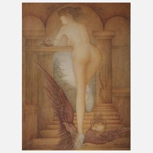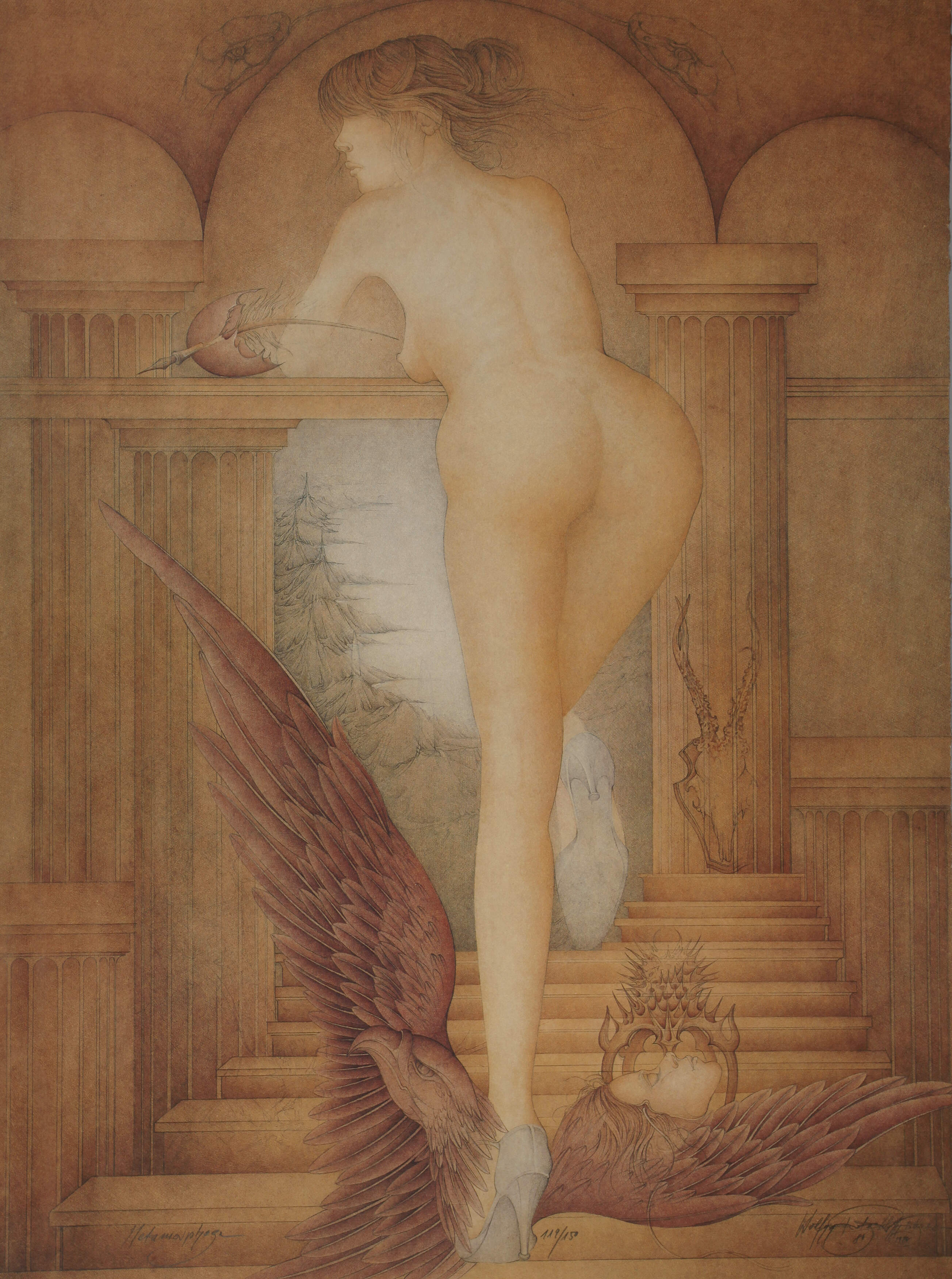 auf einem Adler stehender weiblicher Rückenakt, Farboffset auf Velin, im unteren Bereich rechts signiert und datiert "Wolfg. Fratscher (19)84", mittig nummeriert "119/150" sowie links betitelt "Metamorphose", Blattmaße ca. 79,5 x 59,5 cm. Künstlerinfo: dt. Graphiker (1944 Rendsburg bis 2009 Buchholz), 1964–68 Studium an der Fachhochschule für Gestaltung Hamburg, 1968–69 Meisterschüler an der Fachhochschule für Gestaltung Hamburg, seit 1971 als freischaffender Maler und Graphiker tätig, Quelle: Lot-tissimo und Internet.