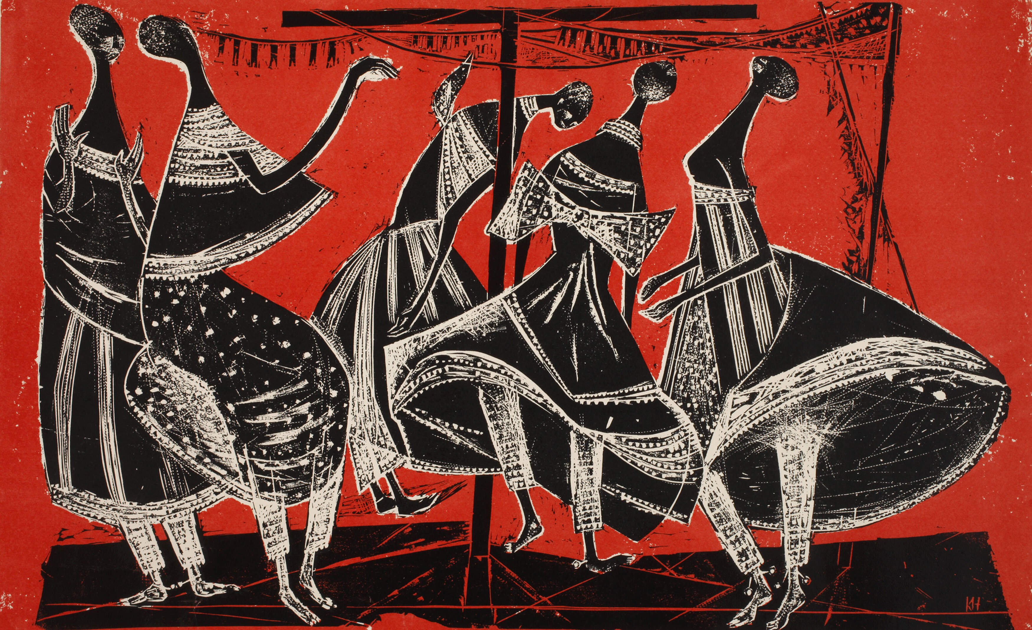 Gruppe von fünf tanzenden Frauen, Farbholzschnitt, unter der Darstellung in Blei signiert und datiert "Hansen 1965", weiterhin im Stock ligiertes Monogramm "KH", rückseitig Spuren alter Montierung, minimal lichtrandig, leichte Quetsch- und Faltspuren, Darstellungsmaße ca. 38,7 x 65,5 cm, Blattmaße ca. 44,5 x 71,8 cm. Künstlerinfo: eigentl. Karl-Heinz Hansen, dt. Maler und Graphiker (1915 Hamburg bis 1978 São Paulo), 1930–1933 Lehre als Maler, 1935–36 Matrose bei der Reichsmarine, anschl. Soldat im 2. Weltkrieg, 1946 und 1947 Entstehung seiner ersten Holzschnittfolgen, 1949 Einladung der Gripenberg-Stiftung nach Schweden, anschl. Auswanderung nach Brasilien, erste Ausstellung seiner Holzschnitte im Museu de Arte de São Paulo, Förderung durch Pietro Maria Bo Bardi, 1955 Reise nach Salvador da Bahia und lies sich hier nieder, 1959 Rückkehr nach Deutschland, 1960 Gründung einer Sommerschule für Holzschnitt auf Burg Tittmonong im Landkreis Traunstein,1963 übernahm er eine Professur in Addis Abeba/Äthiopien, 1966 Aufgabe des Lehramtes in Addis Abeba und Rückkehr nach Brasilien, Annahme einer Professur für Graphik an der Universität Salvador-Bahia, weiterhin Lehraufträge in Bogotá/Kolumbien und Belo Horizonte/Brasilien, Bau eines Atelierhauses in Itapoan/Bahia, Quelle: Vollmer-Nachtrag, Wikipedia und Internet.