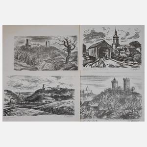 betitelt "Burgen an der Saale", "Alte Ilmbrücke i. Bad Sulza", "Die Eckartsburg" und ohne Titel (Eckartsburg), Lithographien auf leichtem Karton, drei Arbeiten datiert "1983" und signiert "K. Holfeld", ungerahmt, Darstellungsmaße ca. 23 x 34 cm, Blattmaße max. ca. 37,5 x 50 cm. Künstlerinfo: dt. Maler, Graphiker und Restaurator (1921 Georgswalde/Tschechoslowakei bis 2009 Bad Sulza), Lehre zum Dekorationsmaler, Reichsarbeitsdienst, Soldat im 2. Weltkrieg, 1944–46 französische Kriegsgefangenschaft, 1949–53 Studium an den Kunsthochschulen Weimar und Dresden bei Otto Herbig und Hans Grundig, ab 1953 in Bad Sulza ansässig, 1985–89 Restaurierung der Taufkapelle und des Altars der Seemannskirche in Prerow, Mitglied im VBK der DDR, Quelle: Vollmer, Eisold „Künstler in der DDR“ und Wikipedia.