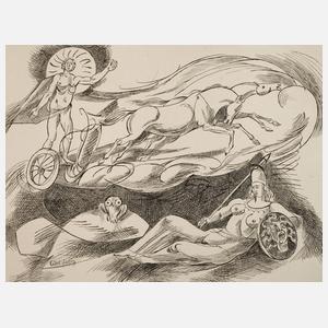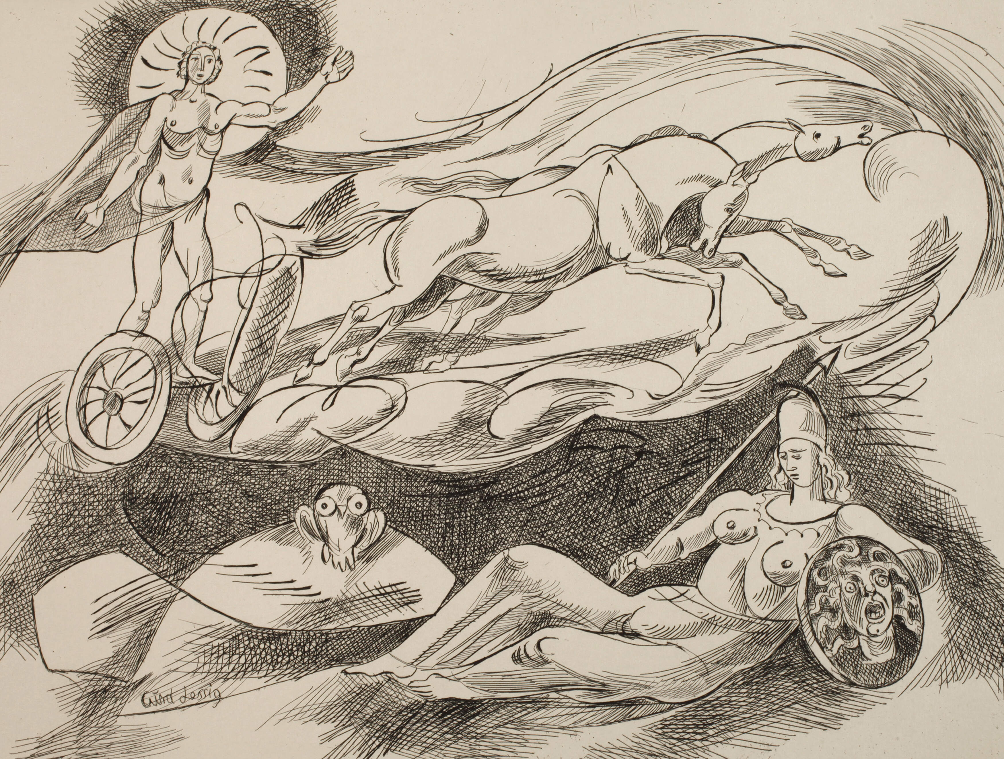 Apollo, der Gott des Lichts im von Pferden gezogenen Wagen und Athene, die Göttin der Weisheit mit Eule, Radierung, um 1990, Radierung auf gräulichem Papier, unter der Darstellung in Blei rechts signiert "Curt Lessig" und mittig betitelt "Apollo u Athene", in der Platte links signiert "Curt Lessig", Darstellungsmaße ca. 29,5 x 40 cm, Blattmaße ca. 39,5 x 49 cm. Künstlerinfo: dt. Graphiker, Maler und Gestalter von Kirchenfenstern (1924 Stuttgart bis 2019 Würzburg), 1939–40 Studium der Malerei bei Heiner Dikreiter, 1940–42 Lehre als Kirchenmaler in Würzburg, 1942–46 Soldat im 2. Weltkrieg und Kriegsgefangenschaft, 1947 Gründungsmitglied des Berufsverbandes bildender Künstler in Ober- und Unterfranken, 1948–59 Studium der Malerei an der Akademie in München bei Walther Teutsch, tätig als Kirchenmaler, ab 1957 freischaffend tätig, zahlreiche Studienreisen, Quelle: Wikipedia und Internetpräsenz des Künstlers.