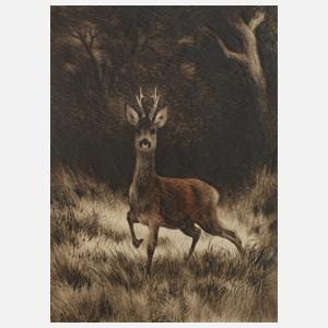 auf einer kleinen Lichtung stehender Rehbock, Farbradierung, um 1970, unter der Darstellung in Blei bezeichnet "Original Radierung v. Meyer-Eberhardt", hinter Glas gerahmt, Darstellungsmaße ca. 27,5 x 20,5 cm, Blattmaße ca. 50 x 37,5 cm. Künstlerinfo: eigentlich Kurt Ernst Meyer, nannte sich ab 1916 Curt Meyer-Eberhardt, dt. Tiermaler und Radierer (1895 Leipzig bis 1977 München), studierte an der Akademie Weimar bei Max Thedy, Theodor von Hagen und Walter Klemm, kurzzeitig Schüler am Bauhaus bei Lyonel Feininger, Mitglied im Reichsverband Bildender Künstler Deutschlands, tätig in München, Quelle: Thieme-Becker, Vollmer, Dressler und Internet.
