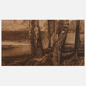 vor einem Bauerngehöft stehende Birken und im Hintergrund Kiefernwald, in Braun gedruckte Radierung, um 1920, unter der Darstellung in Blei rechts signiert "Leon Schnell" und links nummeriert "20/100", am unteren Blattrand links betitelt "Birkenstämme", etwas gegilbt und leicht fleckig, Darstellungsmaße ca. 30,5 x 53 cm, Blattmaße ca. 50 x 62 cm. Künstlerinfo: eigentlich Leone Schnell, dt. Radierer, Kupferstecher und Briefmarken- und Banknotenkünstler (1888 Venedig bis 1961 Freiburg/Breisgau oder Westberlin?), studierte an der Akademie Berlin, schuf von 1843–58 zahlreiche Entwürfe und Stiche von Briefmarken, Mitglied der Freien Vereinigung der Graphiker zu Berlin, tätig in Berlin, später in Westberlin, Quelle: Dressler, Akten der Reichskammer der Bildenden Künste Berlin, Internet, Saur Bio-Bibliographisches Lexikon und Vollmer.