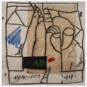 Geflecht aus Strichen über beigem Feld und die Buchstaben "AB" auf schwarzem Grund, Mischtechnik (Radierung, Deckfarbe, Farbkreide und Chine-coleé) auf Bütten, Ende 20. Jh., im unteren Bereich rechts in Blei signiert "J. Coignard", links unten nummeriert "27/50", in Passepartout freigestellt und unter Glas gerahmt, Blattmaße ca. 21 x 21 cm. Künstlerinfo: frz. Maler und Graphiker (1925 Tours bis 2008 Antibes), 1948 fasste er den Entschluss Künstler zu werden und studierte an der École de Arts Décoratifs in Nizza, Kontakt zu Marc Chagall, Henri Matisse und Georges Braque, ab Ende der 1960er Jahre Beschäftigung mit der Carborundum-Technik, weltweit in zahlreichen Museen und Galerien vertreten, Quelle: Wikipedia.