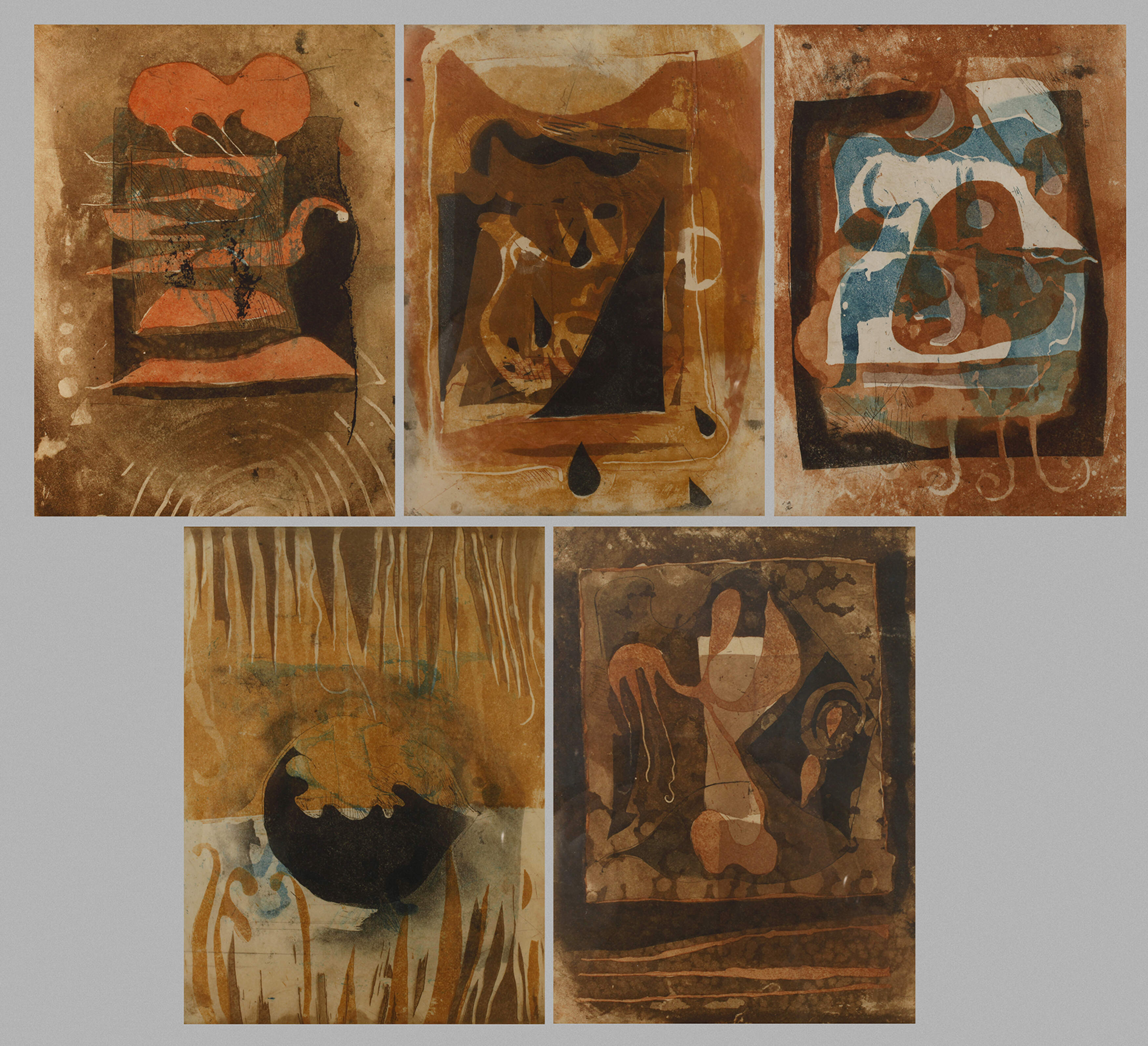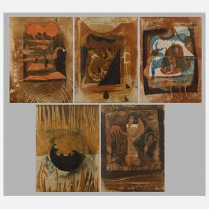 ungegenständliche Radierungen in abgestimmter Farbigkeit, jeweils unter der Darstellung in Blei rechts unleserlich signiert und datiert "... (19)69", links mit "e. a." bezeichnet und mittig betitelt, teils geringe Erhaltungsmängel, drei Blatt im rahmenlosen Bilderträger hinter Glas gerahmt, Darstellungsmaße ca. 24 x 18 cm, Blattmaße ca. 59 x 41 cm.