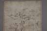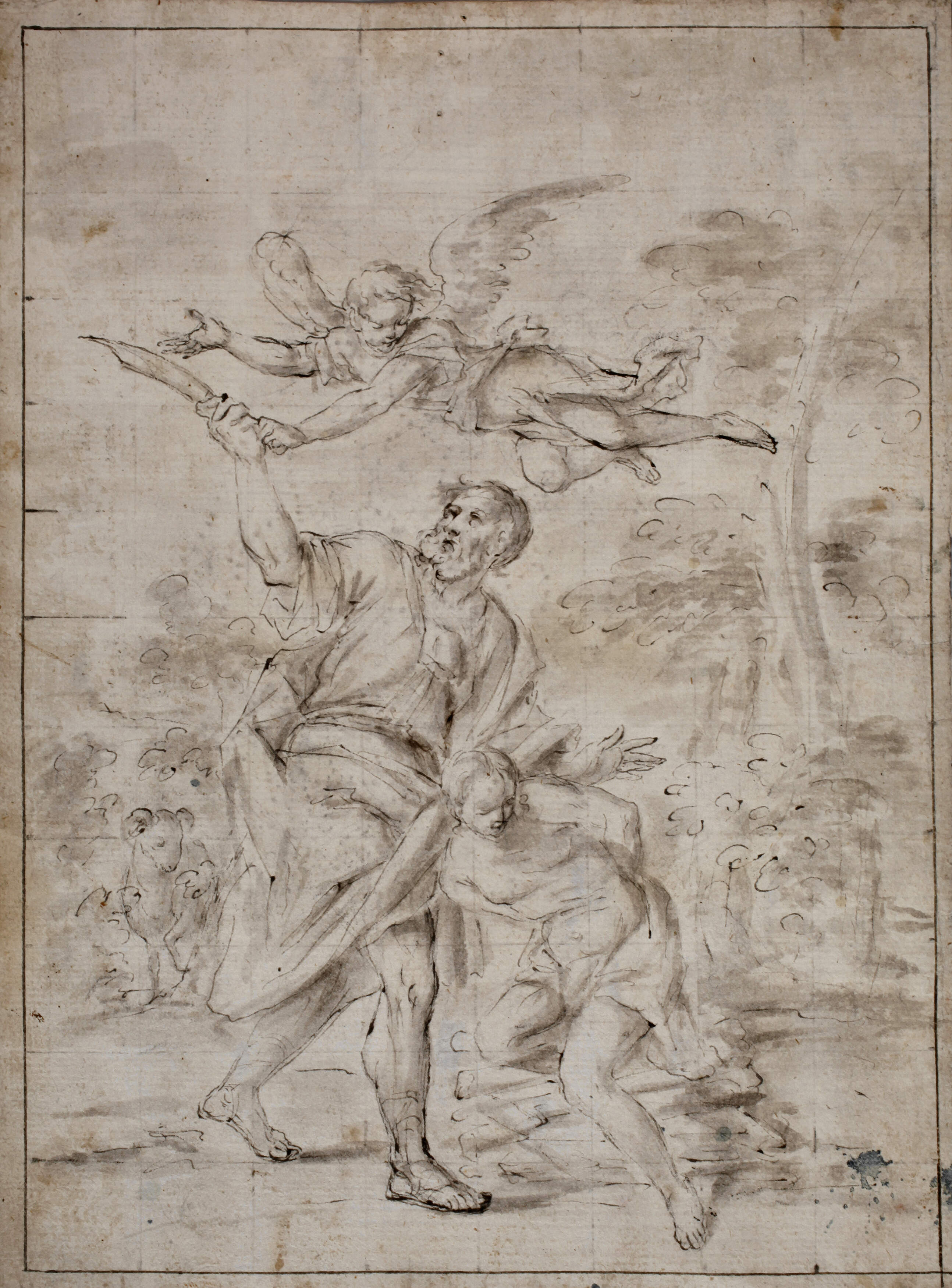 Darstellung der alttestamentarischen Szene der Erprobung des Gehorsams Abrahams durch Gott, sie zeigt die im letzten Moment abgewendete Opferung bzw. "Bindung Isaaks" durch seinen Vater Abraham, hierzu berichtet das 1. Buch Mose [22,1-13] "... Nach diesen Ereignissen stellte Gott Abraham auf die Probe. Er sprach zu ihm: Abraham! ... Nimm deinen Sohn, deinen einzigen, den du liebst, Isaak, geh in das Land Morija und bring ihn dort auf einem der Berge, den ich dir nenne, als Brandopfer dar! ... Als sie an den Ort kamen, den ihm Gott genannt hatte, baute Abraham dort den Altar, schichtete das Holz auf, band seinen Sohn Isaak und legte ihn auf den Altar, oben auf das Holz. Abraham streckte seine Hand aus und nahm das Messer, um seinen Sohn zu schlachten. Da rief ihm der Engel des Herrn vom Himmel her zu und sagte: Abraham, Abraham! ... Streck deine Hand nicht gegen den Knaben aus und tu ihm nichts zuleide! Denn jetzt weiß ich, dass du Gott fürchtest; du hast mir deinen Sohn, deinen einzigen, nicht vorenthalten. Abraham erhob seine Augen, sah hin und siehe, ein Widder hatte sich hinter ihm mit seinen Hörnern im Gestrüpp verfangen. Abraham ging hin, nahm den Widder und brachte ihn statt seines Sohnes als Brandopfer dar. ...", flott erfasste Tuschfederzeichnung auf Bütten, partiell laviert mit aufgemalter Quadrierung, wohl 18. Jh., unsigniert, fleckig und Altersspuren, ungerahmt, Blattmaße ca. 28 x 20 cm.
