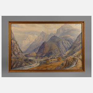 Blick von einer Anhöhe vorbei am Wasserfall des Bristenbachs und Weinbergen zur Ortschaft Amsteg (heute zur Gemeinde Silenen), mit der historischen Plattibrücke und Kirche im engen Talgrund der Reuss an der Einmündung des Kärstelenbachs, überragt vom imposanten Bergmassiv des Chli Windgällen und des Groß Windgällen in den Glarner Alpen im Kanton Uri, ein ähnliches Motiv erschien als Lithographie in H. Runge "Die Schweiz in Original-Ansichten ihrer interessantesten Gegenden. Nach der Natur aufgenommen und in Stahl gestochen von den ausgezeichnetsten Künstlern unserer Zeit" bei G. G. Lange Darmstadt 1861–66, hier irrtümlich als "Amstag" bezeichnet, feinst mit spitzem Pinsel festgehaltene, romantisch überhöhte Landschaftsmalerei, Aquarell und Bleistift auf Papier, rechts unten undeutlich signiert "B. Bownas" oder "R. Bownas" und datiert "1879", rückseitig aufgeklebtes altes Etikett mit teils undeutlicher englischer Aufschrift "Bristen (view from) near Amstag ... [dt.: Bei Amstag [meint "Amsteg"] (Blick aus Richtung) Bristen ...]", gering geblichen und gegilbt, hinter Glas in Goldleiste gerahmt, Falzmaße ca. 62 x 96 cm.