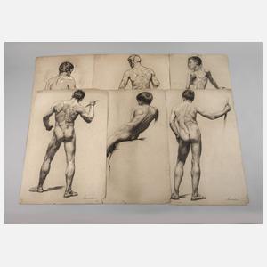 sechs Blatt mit der Darstellung männlicher Akte, zwei Blatt davon beidseitig bezeichnet, Graphit mit Weißhöhung auf gräulichem Papier, um 1900, zwei Blatt bezeichnet "Amarzilien", im Randbereich teils Verluste, leichte Erhaltungsmängel, Blattmaße max. ca. 63 x 43 cm.
