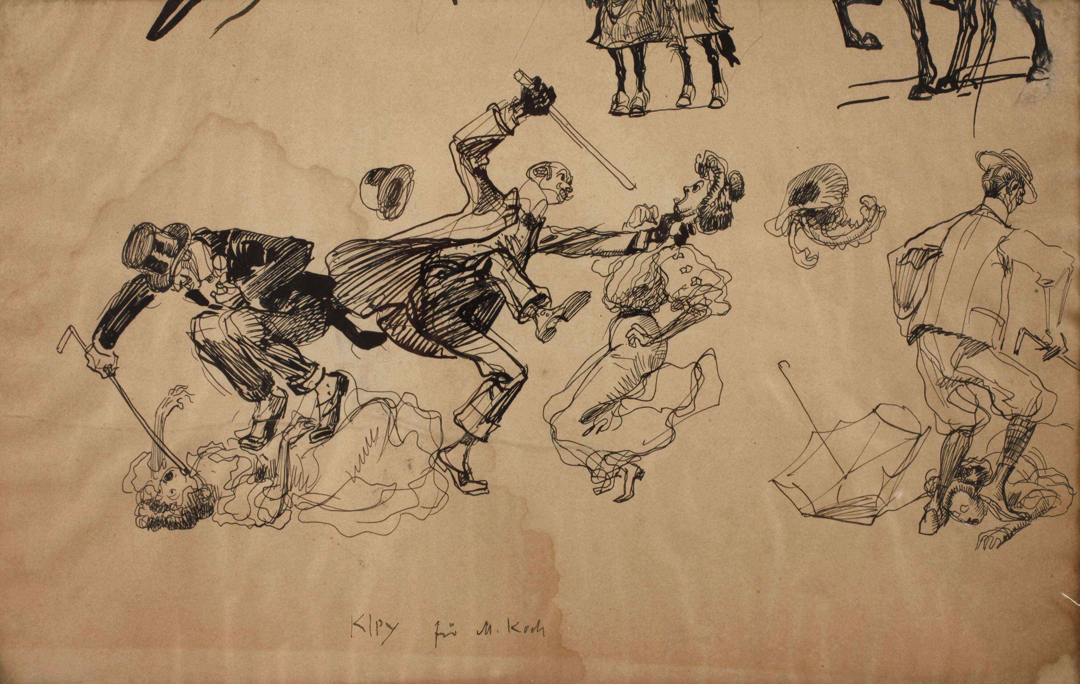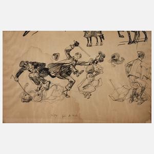 Studienblatt mit verschiedenen teils martialischen Szenen, beidseitig bezeichnet, Tuschefeder auf Papier, um 1910, jede Seite signiert und gewidmet "Kley für M. Koch", Papier wellig, wasserrandig und gegilbt, zwischen zwei Glasscheiben montiert, Blattmaße ca. 17 x 26 cm. Künstlerinfo: dt. Maler, Zeichner, Radierer und Illustrator (1863 Karlsruhe bis 1945 München), 1880–85 Studium an der Karlsruhe Kunstschule, ab 1901 lieferte er für die Krupp-Gussstahlfabrik in Essen Vorlagen für Postkarten, in den kommenden Jahren war auch als Industriemaler für verschiedene Firmen wie Voith, Grün & Bilfinger und MAN tätig, Mitarbeiter des Simplicissimus und der Jugend, beendete mit der Machtergreifung Hitlers die Zusammenarbeit mit allen Verlagen, Quelle: Thieme-Becker, Vollmer und Wikipedia.