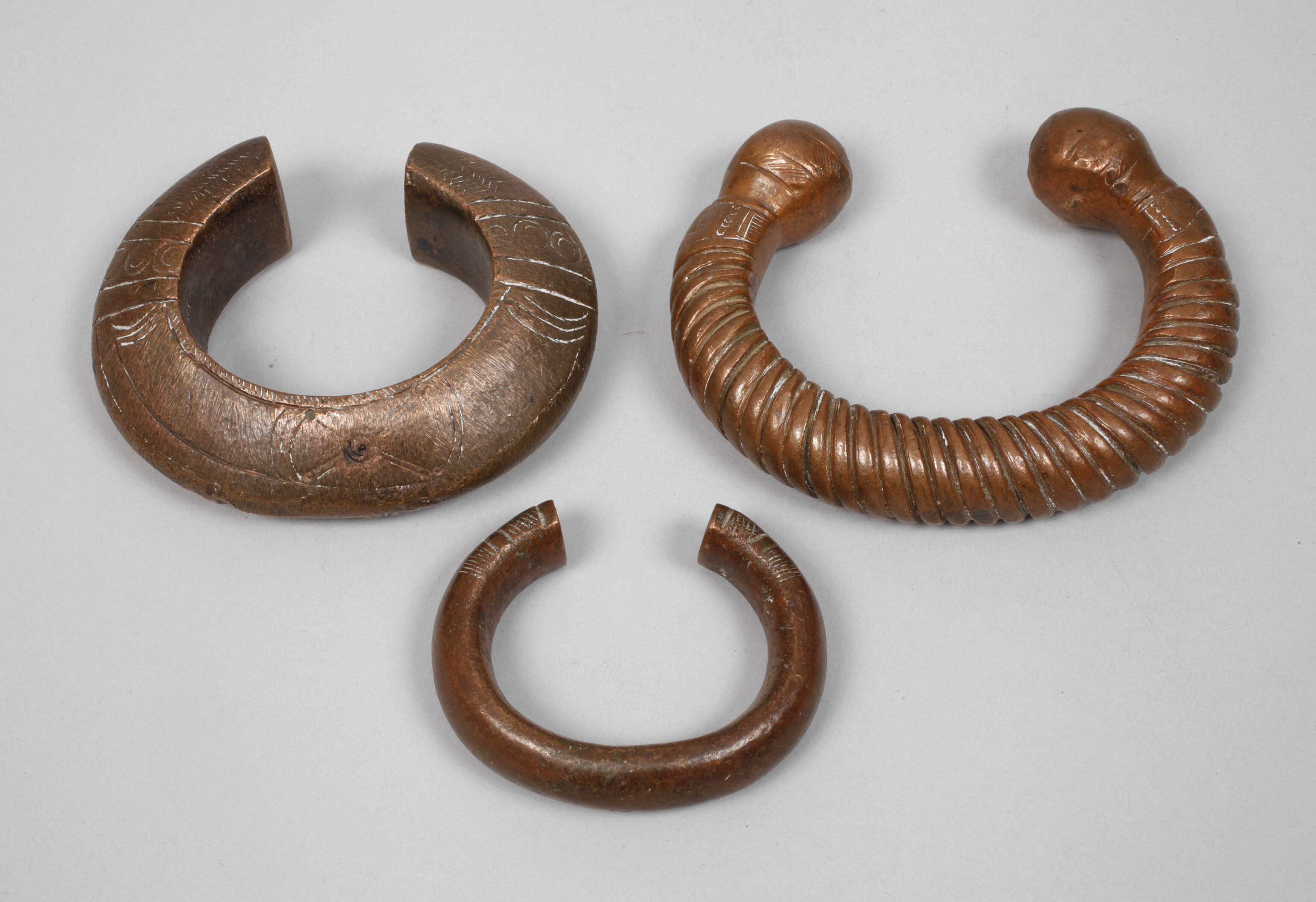 Westafrika, 20. Jh., Kupfer massiv, teils ornamental punziert, drei verschieden große Reife als Währung, Alters- und Korrosionsspuren, D max. 13 cm.