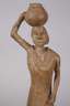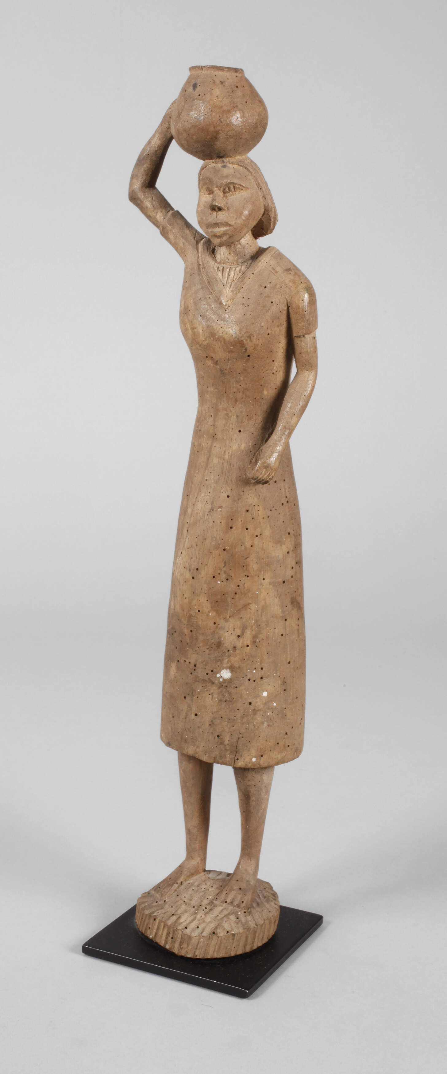 Madagaskar, Gruppe der Mahafaly, 1. Hälfte 20. Jh., weibliche Standfigur in stilisierter Formensprache, einen Wassertrog auf dem Kopf tragend, auf späterem geschwärzten Eisensockel montiert, wurmstichig, kleine Substanzverluste, Altersspuren, H 43,5 cm. Provenienz: 1977 in Ambositra auf Madagaskar erworben, seitdem in zwei deutschen Privatsammlungen.