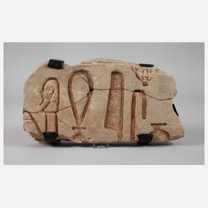 Alter unbestimmt, Fragment eines historischen Frieses, aus hellem Sandstein gehauen, es zeigt ägyptische Hieroglyphen und Figuren, als Einzelsegmente durch geschwärzte Eisengussmontierung gefasst, Maße 40 x 20 cm. Provenienz: laut Einliefererangaben aus der Sammlung Dr. Langendörfer.