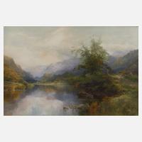 stiller, von Büschen und Bäumen umgebener See vor imposanter Bergkulisse, einfühlsame Landschaftsmalerei mit schöner Behandlung des Lichts, Mischtechnik (Aquarell und Deckfarben, rechts unten signiert "Edmund Phipps (19)08", minimal fleckig, hinter Glas gerahmt, Falzmaße ca. 51 x 76,5 cm. Künstlerinfo: engl. Landschaftsmaler (tätig von 1884 bis 1915), arbeitete in Liverpool und Glan Cown, Clwyd, Quelle: Internet.