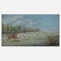flache Landschaft mit einigen Büschen und Jäger zu Pferd mit seinen Hunden bei der Verfolgung eines Wolfs, Deckfarben auf Papier, rechts unten signiert und datiert "G Swertschkoff 1932", auf der Rahmenrückwand alter Klebezettel und hier bezeichnet "Georges Swertloff/67 rue de la Faisanderie/Paris (16)/"Chasse á loup"", minimale Altersspuren, hinter Glas im Impressionistenrahmen, Sichtmaße ca. 21,3 x 37,3 cm. Künstlerinfo: auch Sverchkov, russischer Maler (1872 St. Petersburg bis 1957 Paris), auch in Deutschland tätig, Quelle: Internet.